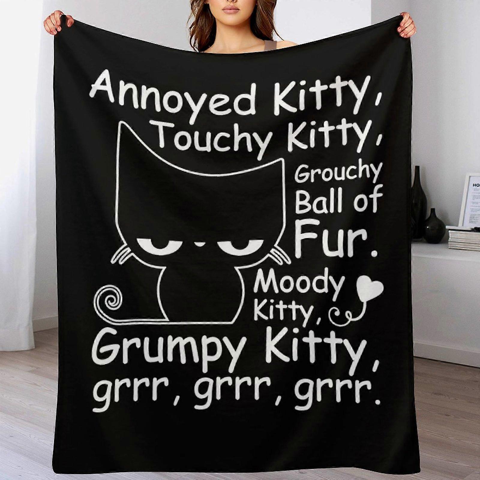 “Annoyed Kitty Touchy Kitty” Funny Cat Quote Graphic Fleece Blanket, Cute Cartoon Line Art Print Cozy Soft Throw for Bedroom Sofa Living Room, Cat Lov
