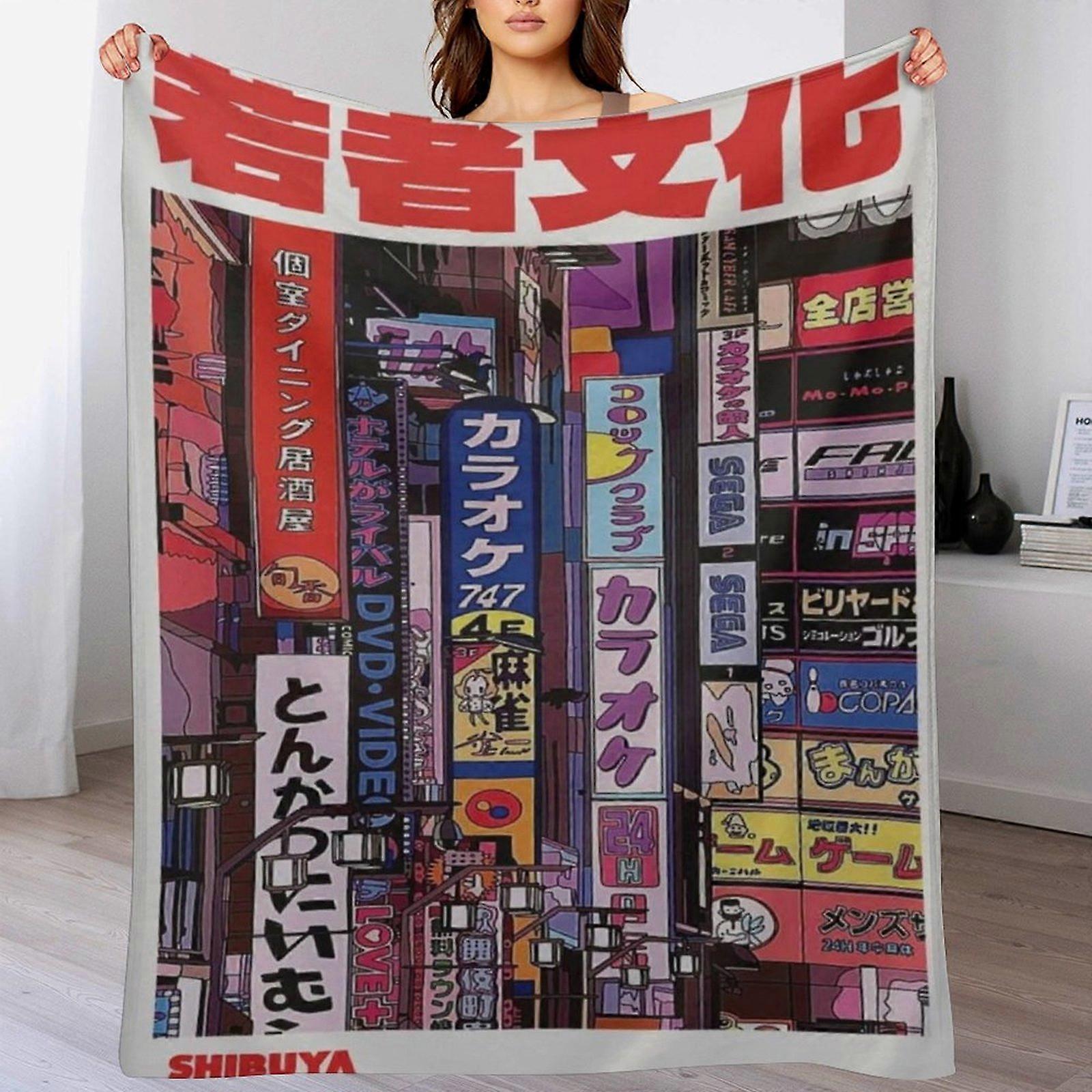 “Shibuya Street Sign Print Blanket - Japanese Neon Culture Design | Soft Warm Throw for Home | For Anime & Urban Decor Lovers”
