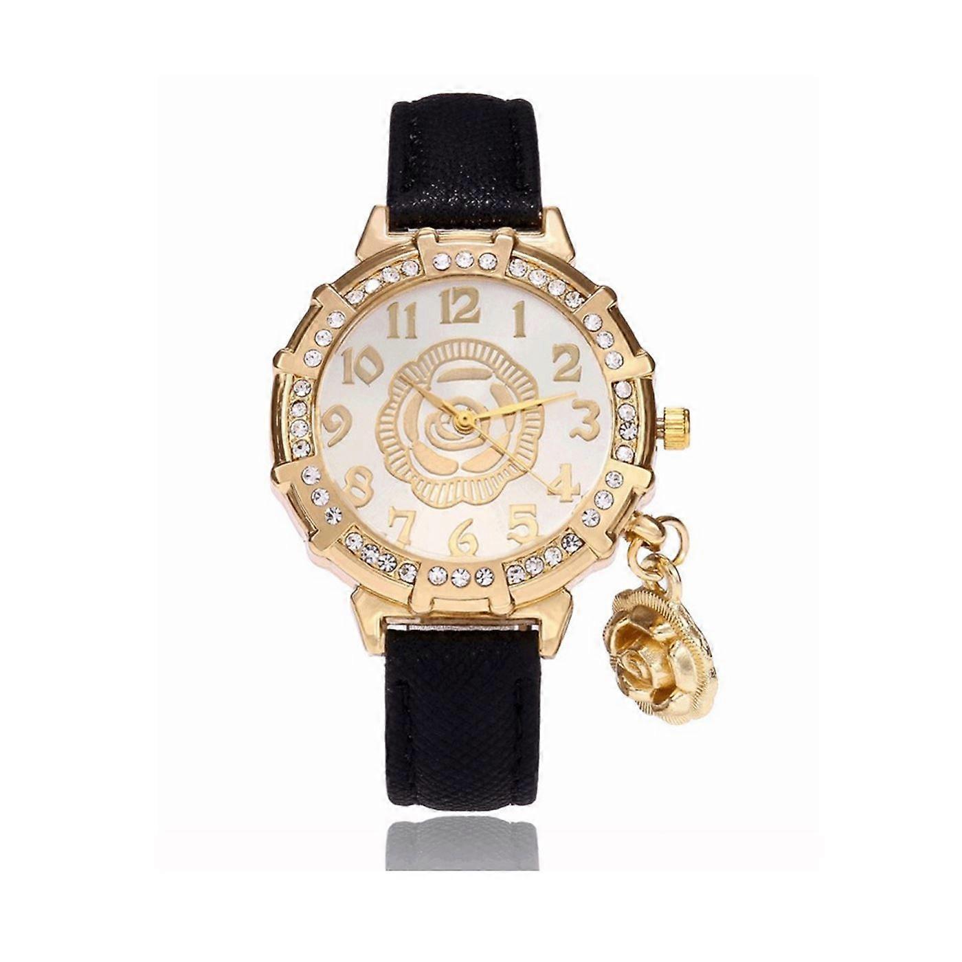 Classy Yellow Gold Flower Watch Luxury Stones Elegant Time Black