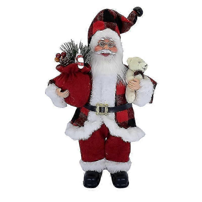 Adorable Sitting Santa: This cute sitting Santa wears trendy red plaid winter clothes, paired with a meticulously crafted hat, holding a gift bag and a bear in his hand, which is super cute, elegant, beautiful, and charming, bringing a strong Christmas atmosphere.Perfect Decoration: This sitting Santa is highly suitable for your mantelpiece, table, bookshelf, or other higher shelves. It's fantastic to see them sitting atop the mantel, guarding the hearth around the warm fire. This cute sitting doll is the perfect Christmas home decoration.Best Gift: Santa is considered a lucky charm, so it's a great gift to bring good luck to family and friends.Guaranteed Materials: This sitting Santa is made of soft and durable materials, which are environmentally friendly and safe, and can be placed at home, in the office, or as a gift for family and friends. He will add a touch of Christmas luxury to any family, suitable for people of all ages.Size: 17 * 10 * 33cm (W * D * H)Material: enamel + plastic + velvet