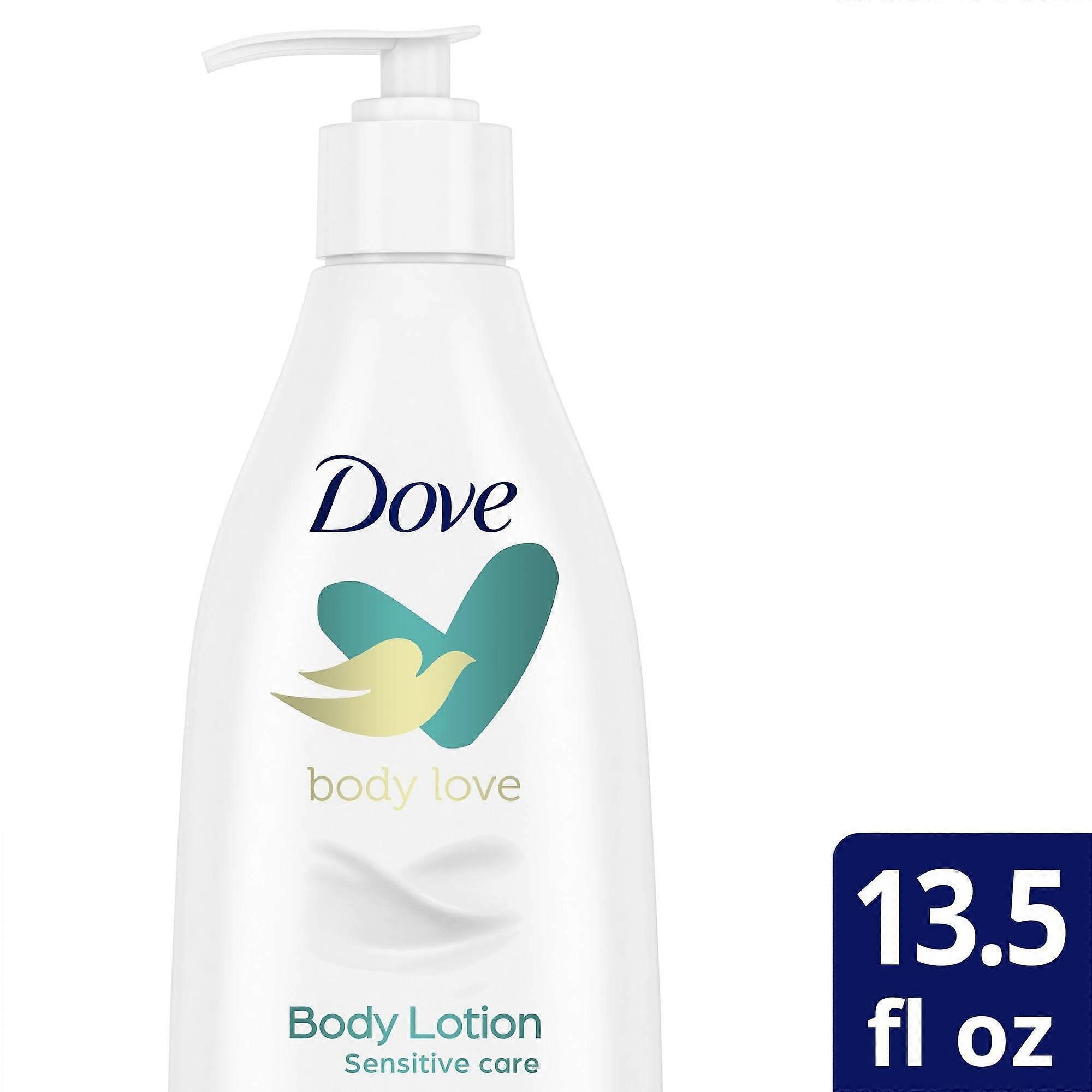 Dove believes in Body Love. That means caring for your body and showing it some love, no matter how you're feeling about it. With the new Dove Body Love collection, our hand and body lotions combine care for your skin with self-care for you. With a fast-absorbing and non-greasy formula, Dove Body Love Sensitive Care Body Lotion soothes and cares for comforted and soft skin. Our Restoring Ceramide Serum is a unique blend of ingredients designed to replenish ceramides with nutrients that strengthen the skin's moisture barrier. This fragrance-free and hypoallergenic lotion for dry skin is also dermatologist-approved, making it suitable for sensitive skin, and perfect for everyone. So show your body some love with this rich and creamy formula that beautifully nourishes very dry skin. Compared to untreated skin, your skin will retain 9x more moisture with up to 48 hours of moisturization. For an indulgent treat, simply massage this body cream for dry skin, paying special attention to areas of dry skin. Use this body lotion after a bath or shower with Dove Sensitive Skin Body Wash for softer and smoother skin that lasts. Or try applying your lotion before bed, so very dry skin will have time to absorb all the nourishment it can while experiencing the body love it deserves. Explore our dermatologist-approved, fragrance-free, fast-absorbing, non-greasy, hypoallergenic, and cruelty-free range of Dove Body Love skin care. Dove does not test on animals anywhere in the world, is certified Cruelty-Free by PETA, and made with 100% recycled bottles. At Dove, our vision is a world where beauty is a source of confidence and not anxiety. So, we are on a mission to help the next generation of women develop a positive relationship with the way they look—helping them raise their self-esteem and realize their full potential.Dove Body Love Fragrance-Free Body Lotion for Rough or Dry Skin Sensitive Care Soothes and Comforts Sensitive Skin 13.5 oz SENSITIVE CARE FOR DRY SENSITIVE SKIN: Give your body the love and care it deserves with Dove Sensitive Care soothing body lotion for softer, comforted skin. RETAINS 9X MORE MOISTURE THAN UNTREATED SKIN: Beautifully nourishes dry skin and provides long-lasting 48-hour moisturization. INFUSED WITH RESTORING CERAMIDE SERUM: The unique blend of ingredients in Dove Intense Care body lotion is designed to replenish ceramides with nutrients that strengthen the skin's moisture barrier. DERMATOLOGIST-APPROVED: This fragrance-free, fast-absorbing, non-greasy, and hypoallergenic moisturizer provides long-lasting care for sensitive skin. MAKE EVERY BODY CARE MOMENT COUNT: Use this body lotion after a bath or shower with Dove Sensitive Skin Body Wash for softer and smoother skin that lasts. SKIN CARE THAT GOES FURTHER: 100% Recycled bottles. PETA Cruelty-Free. Globally, Dove does not test on animals. We aim to show you accurate product information. Manufacturers, suppliers and others provide what you see here, and we have not verified it.