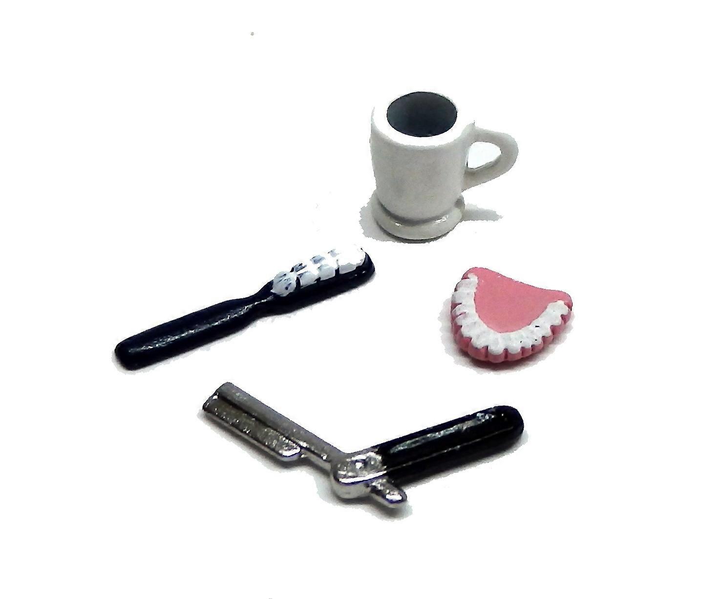 Dolls House Miniature False Teeth Mug Toothbrush Shaving Set Bathroom Accessory