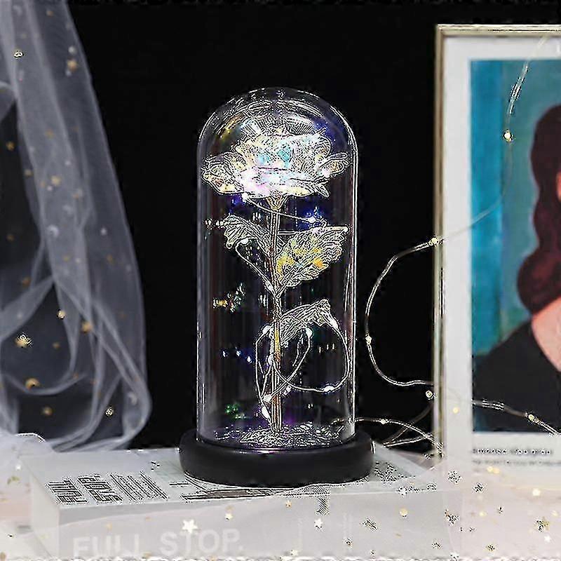 SizesColorful artificial rose in glass dome gift specifications: product quantity:1pcs Material: plastic + glass + wood Product color: rainbow Product size: 4.5 inches x 8.7 inches / 11.5 (base diameter) x 22 cm. LED quantity: 20 pieces. Product weight: 0.4 kg.Materials: eternal roses unique gift is 100% handmade and includes colourful roses, LED string lights, glass dome, wooden base. Forever rose will never be hidden. The beauty and the animal rose kit flowers symbolise constant hope and eternal love. Good luck and beauty are always there.Design: Galaxy rose flowers are coated with gold foil and stored in a glass dome that is transparent without impurities. The glass rose wooden base is stable and has a smooth surface. Both glass and wooden base are easy to clean.Occasions: enchanted rose gift for mum brings harmony and best wishes to you. Perfect forever roses best gifts for women, lovers, friends on birthday, Mother's Day, anniversary, Valentine's Day, Christmas, wedding. Flowers for Mother's Day can be used during the day and at night for room decoration.Packaging: birthday gifts rose flower for women come with a pink packaging gift box, so you can give directly without spending time on the package. We offer the most satisfactory service experience. If you have any questions, please contact us. We offer 12 hours online service.