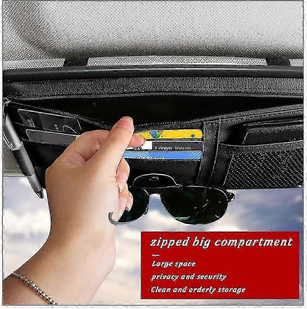 Keep Car Clean and TidyThis car accessories organizer keeps auto documents and convenient to place small items. Without having to hunt for them in the car. Keep driving safelyMulti function and space saving Great sun visor accessory organizer with the 7 Pockets, 1 Sunglass Clip 1 Pen Holders and 1 zipped big compartment. Perfect for storing your cards, driver's license, sunglass, phone, key, wallet, documents, earphones. It is a great helper as a storage bag for your car.Thick and Solid Material Visor Organizer is made of high-quality durable PU Leather. Has sturdy cardboard backing to fit flat against car visor. Can satisfy your maximum storage weight and prevent the middle sag and drop. Size Fits Most Car Visor Organizer with a length-adjustable elastic velcro band. Fits most car, SUV, truck, jeep visors perfectly ( 12.4in*6.6in*0.1in).Quick Installation Velcro tape design at the back, take less than 30 seconds to install and remove.Tired of digging in the glove compartment to find your license, registration and insurance cards?Would you like to have your pens, mini notebook, receipts, or any other small routine travel item organized?If you're dealing with these sorts of problems and want to make your life easier... Customized design fits the sun visor of every vehicle. Measuring 12.4" x 6.6" .Suitable for all cars and trucks Adjustable strap for safety and stability. Premium high-quality ABS material and a strong back can support more weight without falling down. With the 7 Pockets, 1 Sunglass Clip, 1 Pen Holder and 1 zipped big compartment. Elastic pocket openings to easily slide in your documents, and tight pockets to ensure nothing falls out whether the visor is up or down. Great design that will suit any car interior. Water-resistant fabric for easy care.Hurry Keep Your Car More Organized And Cleaner And Make Your Life More Easier By Adding This Amazing Sun Visor Organizer To Your