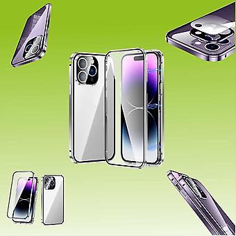 Für Apple iPhone 14 Pro Beidseitiger 360 Grad Magnet Glas Hülle Handy Tasche Bumper Silber