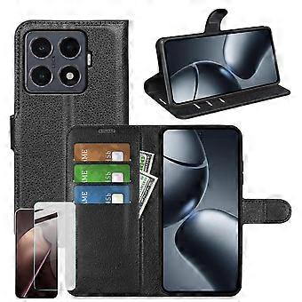 Für Xiaomi 15T Pro Kunstleder Book Wallet Hülle Schwarz + 9H Hart Glas