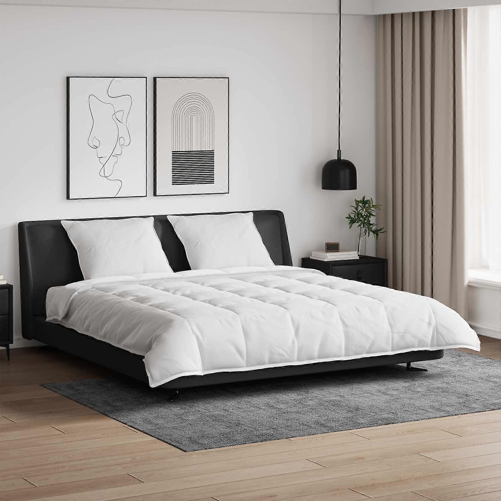 Dieses Winter-Duvet-Set steht für schlichte Eleganz und verwandelt jedes Schlafzimmer in einen gemütlichen Rückzugsort. Ideal für alle, die auf sauberes Design und Funktionalität stehen. Mit diesem Set wird dein Schlaferlebnis großartig und verleiht deinem Raum einen Hauch von Eleganz. Die gesteppten Texturen und der neutrale Weißton schaffen eine ruhige, einladende Atmosphäre, die super zu jedem Einrichtungsstil passt. Stell dir vor, wie du dich in dieses luxuriöse Duvet einkuschelst und dessen sanften Stoff genießt – perfekt für entspannte Nächte und friedliche Morgen. Exquisite Materialien: Dieses Duvet-Set vereint Mikrofaser, Baumwolle und Daunen und sorgt für ein Schlaferlebnis der Extraklasse. Mikrofaser und Baumwolle sind atmungsaktiv und weich, während die Daunen für Wärme und Leichtigkeit in kalten Nächten sorgen, sodass du immer bequem und gemütlich schläfst. Durchdachte Komponenten: Mit einem Duvet und zwei Kissen hast du alles, was du für einen harmonischen Schlafbereich brauchst. Jedes Teil ist mit viel Liebe verarbeitet, die Kissen bestehen aus Baumwolle und haben einen Knopfverschluss, der die Einsätze sicher hält. Funktionale Merkmale: Mit minimalistischen Eigenschaften und einem sanften Touch ist dieses Duvet-Set modern und funktional. Die Kombination aus gestepptem Design und soft-touch-Finish sieht nicht nur schick aus, sondern fühlt sich auch toll an und schafft einen stilvollen Schlafbereich. Vielseitige Verwendung: Es passt problemlos in jedes Schlafzimmer, egal ob du einen modernen urbanen Stil oder etwas Klassisches bevorzugst. Seine minimalistische Eleganz macht es zum Mittelpunkt, der den Raum zusammenhält. Pflege & Instandhaltung: Pflegeleicht mit diesem maschinenwaschbaren Set. Es wird vakuumverpackt geliefert, und leichtes Klopfen stellt seine ursprüngliche Form wieder her, damit deine Bettwäsche immer frisch und einladend bleibt – ohne großen Aufwand. Farbe: WeißMaterial: DaunenfederOberfläche: Soft-TouchGesamtabmessungen: 260 x 220 cm (L x B)Gewicht: 9,43 kgMinimalistischFüllmaterial: Daunen, Federnmit 2 KissenInnen- / Außenbereich: Nur für den InnenbereichLieferumfang:1 x Bettdecke2 x Kissen