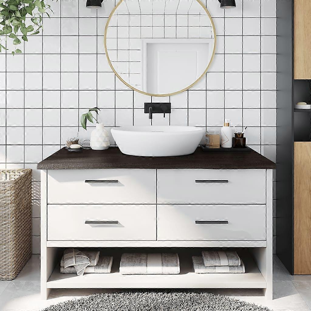Hast du vor, dein Badezimmer zu renovieren? Dann ist diese Waschtischplatte aus Holz eine perfekte Wahl für dich Stabile Konstruktion: Diese Waschtischplatte besteht aus massivem Eichenholz, einem wunderschönen Naturmaterial. Eichenholz weist eine mittelbraune Farbe und eine dichte Maserung auf, was zu seiner einzigartigen Optik beiträgt.Vielseitig einsetzbar: Dieses Holzplatte lässt sich nicht nur als Waschtischplatte verwenden, sondern auch mit verschiedenen Gestellen kombinieren, um als Regal, Schrankoberplatte, Schreibtischplatte, Tischplatte usw. zu dienen.Behandelte Oberfläche: Die Waschtischplatte wurde mit dunkler Lackierung behandelt, sodass sie sofort einsatzbereit ist, da eine zusätzliche Beschichtung nicht erforderlich ist.Handgefertigt mit Naturkante: Diese Waschtischplatte ist handgefertigt und besitzt eine Naturkante. Dabei sind Aststellen, Risse, leicht geschwungene Formen und verschiedene Farbtöne Teil des Eichenholzes und machen jeden Waschtisch zu einem Unikat. Die Lieferung erfolgt nach dem Zufallsprinzip. Gut zu wissen:Als Naturprodukt kann Holz Aststellen und Unebenheiten aufweisen, die wir mit schwarzer Füllung ausfüllen, um ein glattes Aussehen zu gewährleisten. Farbe: DunkelbraunMaterial: Massives Eichenholz mit dunkler OberflächeGesamtabmessungen: 100 x 60 x (2-4) cm (L x B x T)Max. Belastbarkeit: 48 kgMit Naturkante