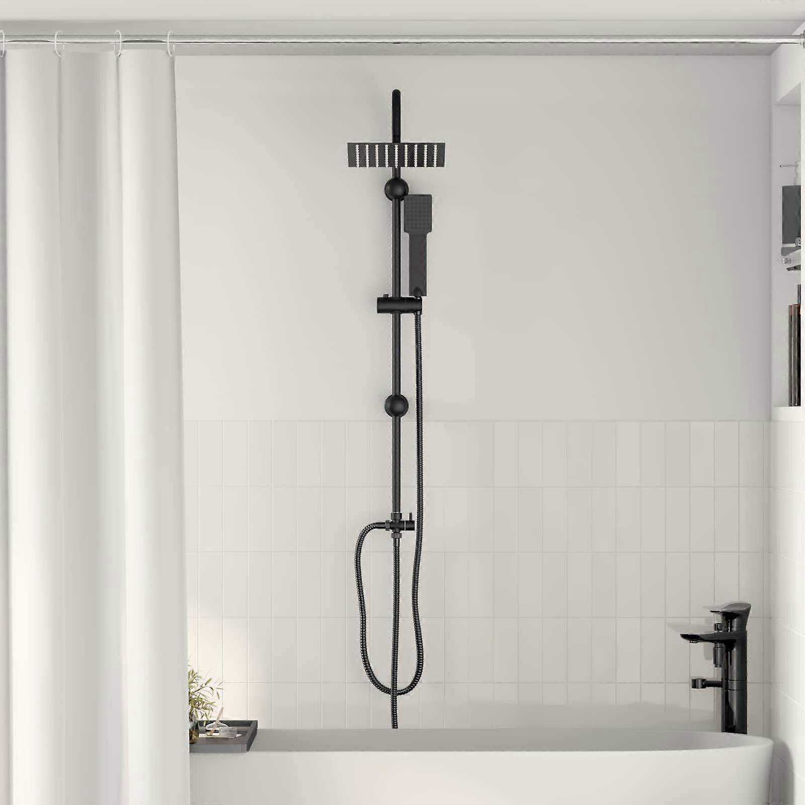 Dieses Duschkopfset ist eine tolle Ergänzung für jedes moderne Bad. Mit schlanken, minimalistischen Linien und einem praktischen Design bringt es die perfekte Mischung aus Stil und Nutzungskomfort. Es fügt sich gut in Wohn- und Hotelumgebungen ein und hat einen einladenden, schicken Look. Die hochwertige Verarbeitung verwandelt deine tägliche Dusche in einen Moment der Entspannung, ideal für alle, die sowohl Ästhetik als auch Funktionalität lieben. Robustes Material: Das Duschkopfset ist hauptsächlich aus Edelstahl, was es besonders widerstandsfähig gegen Feuchtigkeit macht und damit ideal für Badezimmer ist. In Kombination mit Messing- und ABS-Teilen sorgt diese Auswahl für Stabilität und fügt sich harmonisch in jeden modernen Raum ein. Diese Materialien sind langlebig und darauf ausgelegt, dir Sorgen über Abnutzung zu ersparen. Konfigurierbare Komponenten: Der Duschkopf dreht sich um 360° und lässt sich bis zu 15° neigen, um dir ein individuelles Duscherlebnis zu bieten. Der anti-verwicklungs Schlauch sorgt für einen gleichmäßigen Wasserfluss ? kein Verheddern mehr, sodass du bei jedem Duschen erfrischt wirst. Ergonomische Funktionen: Für maximalen Komfort gibt?s diese Handbrause mit drei verschiedenen Wasserfluss-Einstellungen, die dir alles bieten, von sanften Sprühnebeln bis hin zu kräftigen Strahlen. So kannst du deine Dusche je nach Stimmung anpassen ? ob entspannend oder belebend. Vielseitige Anwendung: Perfekt für verschiedene Badezimmer, egal ob Zuhause, in der Ferienwohnung oder im Hotel ? das Set passt sich deinen Bedürfnissen an. Es zahlt sich aus, ob du Entspannung oder Erfrischung suchst. Pflege und Wartung: Um die Langlebigkeit des Sets zu gewährleisten, installiere es genau nach Herstelleranweisung unter Verwendung von Bohrer und Schraubendreher. So garantierst du die ideale Leistung. Farbe: SchwarzGesamtabmessungen: 47 x 20 x 95 cm (L x B x H)Hauptmaterial: EdelstahlSekundäre Materialien: Messing, ABSDuschkopfgröße: 20 x 20 x 4,5 cm (L x B x H)Handbrausegröße: 23 x 6 x 3 cm (L x B x H)Schlauchlänge: 150 cmAnzahl der Düsen (Duschkopf): 81Kippbar2-in-1 DuschsystemVerstellbarer Kopf: dreht sich 360° und neigt sich 15° nach oben und unten, einfach drehen, um die Modi zu wechselnDrehschlauchHandbürste mit drei FunktionenEinfach drehen, um die Modi zu wechselnNur für den InnenbereichMontage erforderlich: JaLieferumfang:1 x Duschkopf Set