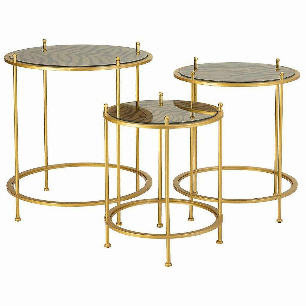 Anzahl der Stücke: 3 StückeArt: Set mit 3 TischenFarbe: GoldMaterial: GlasEisenHolz MDFWaschanleitung: Reinigung mit einem trockenen TuchMaße ca.: 53 x 60 x 53 cm