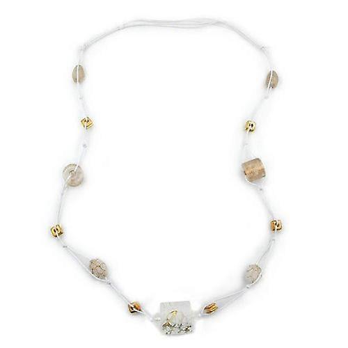 sehr edles Collier mit hochwertigen Kunststoffteilen, Achteck-perle 25x28mm kristall-matt mit aufgespritzten goldfarbenen Fäden, kombiniert mit Walze 18x16mm kristall-transparent Oberfläche gehämmert mit goldfarbenem Überzug, 2-fach Kordel 0,6mm weiß, längenverstellbar mittels Schiebeknoten, in Deutschland gefertigte Handarbeit Länge: 100cm Material: Kunststoff Farbe: weiß Preis per 1 Stck