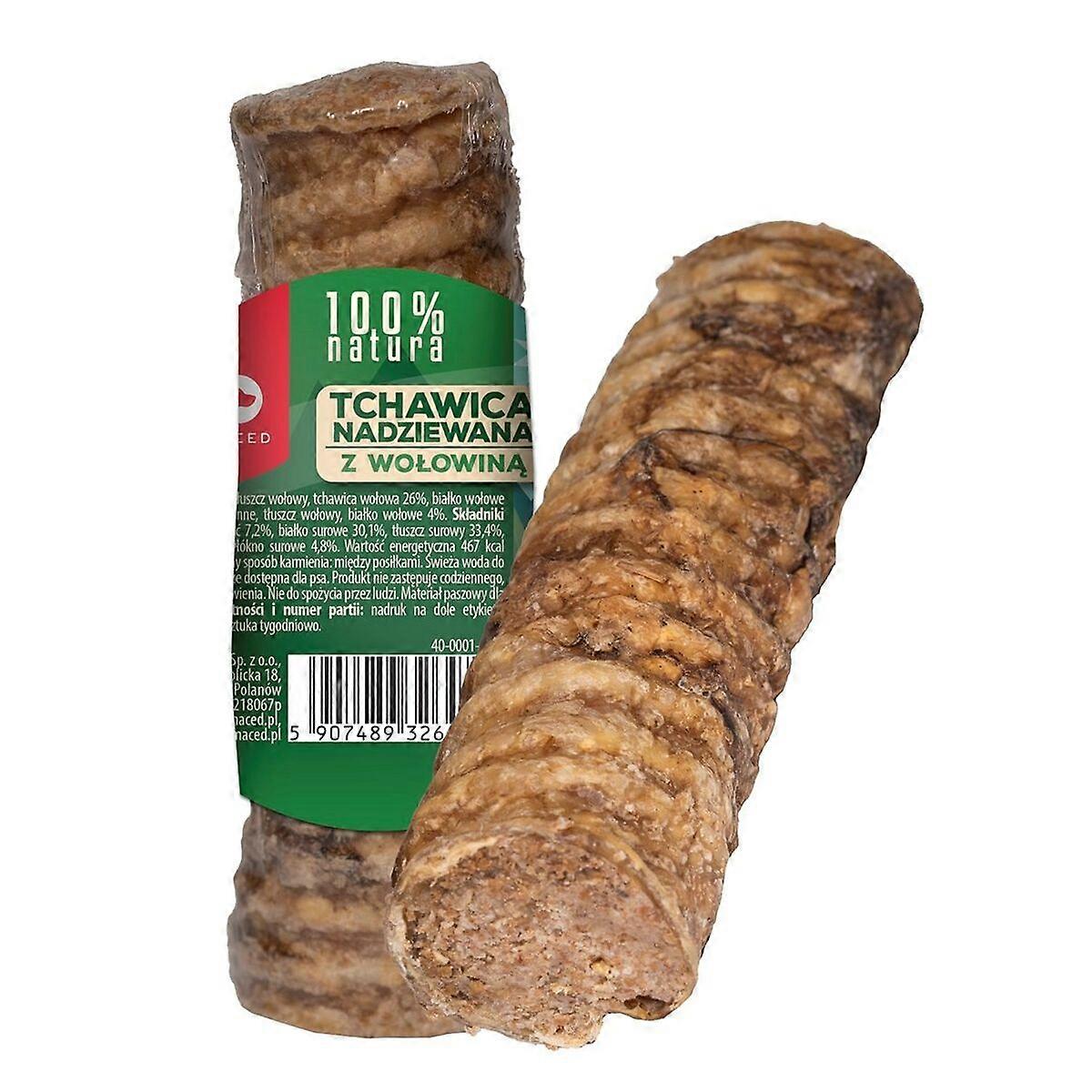 Die mit Rindfleisch gefüllte Luftröhre der Marke Maced ist ein Hundesnack, der sorgfältig aus natürlichen Zutaten hergestellt wird und ein festes, gesundes Kauvergnügen bietet. Mit einem Nettogewicht von 120 Gramm sorgt dieses Produkt für eine feste Textur, die zur Zahnpflege beiträgt, indem sie die Bildung von Zahnstein während des Kauens reduziert. Die Zusammensetzung ohne Konservierungsstoffe und ohne zugesetzten Zucker garantiert eine natürliche und sichere Ergänzung zur täglichen Hundeernährung, ideal für Hunde, die eine saubere, chemiefreie Diät benötigen. Die hochwertige Füllung aus Rindfleisch liefert einen hohen Nährwert und einen attraktiven Geschmack, der sowohl den Genuss als auch die Verdauungsgesundheit der Hunde fördert. Dieser feste Snack eignet sich hervorragend, um gutes Verhalten zu belohnen oder einfach als nahrhafte Belohnung, die den üblichen Standards für Tierpflege und Wohlbefinden entspricht. Maced bietet mit diesem Produkt eine ausgewogene, praktische und verlässliche Option für Tierhalter, die natürliche und funktionale Snacks in einer handlichen, portionierten Form suchen. Zusammengefasst ist es ein Ergänzungsfuttermittel, das die Grundbedürfnisse der Mundhygiene und Hundeernährung mit der Garantie echter Zutaten und einer schonenden Verarbeitung erfüllt.