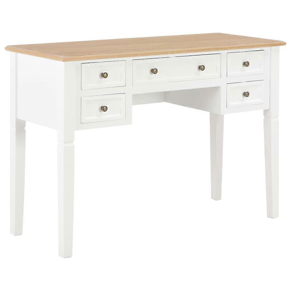 Dieser klassische Schreibtisch hat ein einfaches, zeitgemäßes Design und wird zu fast jedem Dekor passen. Dieser haltbare Tisch verfügt über fünf große Schubfächer, die ausreichend Platz für die Aufbewahrung und Organisierung Ihrer Akten, Papiere, Unterlagen und anderer Büromaterialien bieten. Außerdem bietet die Schreibtischplatte einen großzügigen Raum für die Abstellung Ihres Schmucks oder anderer persönlichen Sachen. Dieser robuste Schreibtisch ist aus hochwertigem MDF und Kiefernholz gefertigt und ist weiß lackiert. Farbe: Braun und WeißMaterial: MDF + KiefernholzGesamtmaße: 109,5 x 45 x 77,5 cm (L x B x H)Maße der großen Schublade: 42 x 34,5 x 8,5 cm (B x T x H)Maße der kleinen Schublade: 18 x 34,5 x 8,5 cm (B x T x H)ACHTUNG: Um ein Umkippen zu vermeiden, muss es mit der mitgelieferten Halterung an der Wand gesichert werden.Legal Documents: Weitere Informationen, wie Sie Ihre Möbel vor dem Umkippen schützen können, finden Sie hier