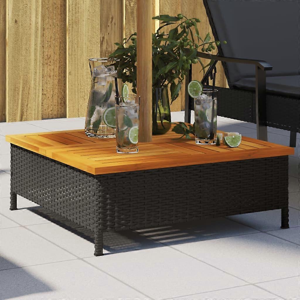 Diese Schirmständer-Verkleidung ist nicht nur eine dekorative Ergänzung zu deinen Sonnenschirm, sondern dient auch als Couchtisch. Sie verleiht deinem Garten oder anderen Außenbereichen einen Hauch von Eleganz. Langlebiges Material: PE-Rattan, auch als Poly Rattan bekannt, ist ein robustes, pflegeleichtes synthetisches Material, das die Optik von natürlichem Rattan aufweist. Es kennzeichnet sich durch ein geringes Eigengewicht und lässt sich einfach reinigen. Aufgrund seiner Haltbarkeit und Witterungsbeständigkeit wird es häufig bei der Herstellung von Gartenmöbeln verwendet.Vielseitig einsetzbar: Dieses Möbelstück lässt sich sowohl als Verkleidung für Sonnenschirmständer als auch als praktischer Couchtisch verwenden und bietet Platz für Blumen, Dekorationen oder Getränke.Stabile und pflegeleichte Tischplatte: Dieser Gartentisch besitzt eine Tischplatte aus Akazienholz, die robust und langlebig ist und sich leicht mit einem feuchten Tuch reinigen lässt.Robuster und stabiler Rahmen: Dank des pulverbeschichteten Stahlrahmens ist das Möbelstück robust, stabil und für den täglichen Einsatz im Außenbereich geeignet. Farbe: Schwarz und BraunMaterial: PE-Rattan, pulverbeschichteter Stahl, massives Akazienholz mit ÖlfinishAbmessungen: 70 x 70 x 25 cm (L x B x H)Innenmaße: 65 x 65 x 24 cm (L x B x H)Durchmesser des Sonnenschirmlochs: 48 mmZusammenbau erforderlich: Ja