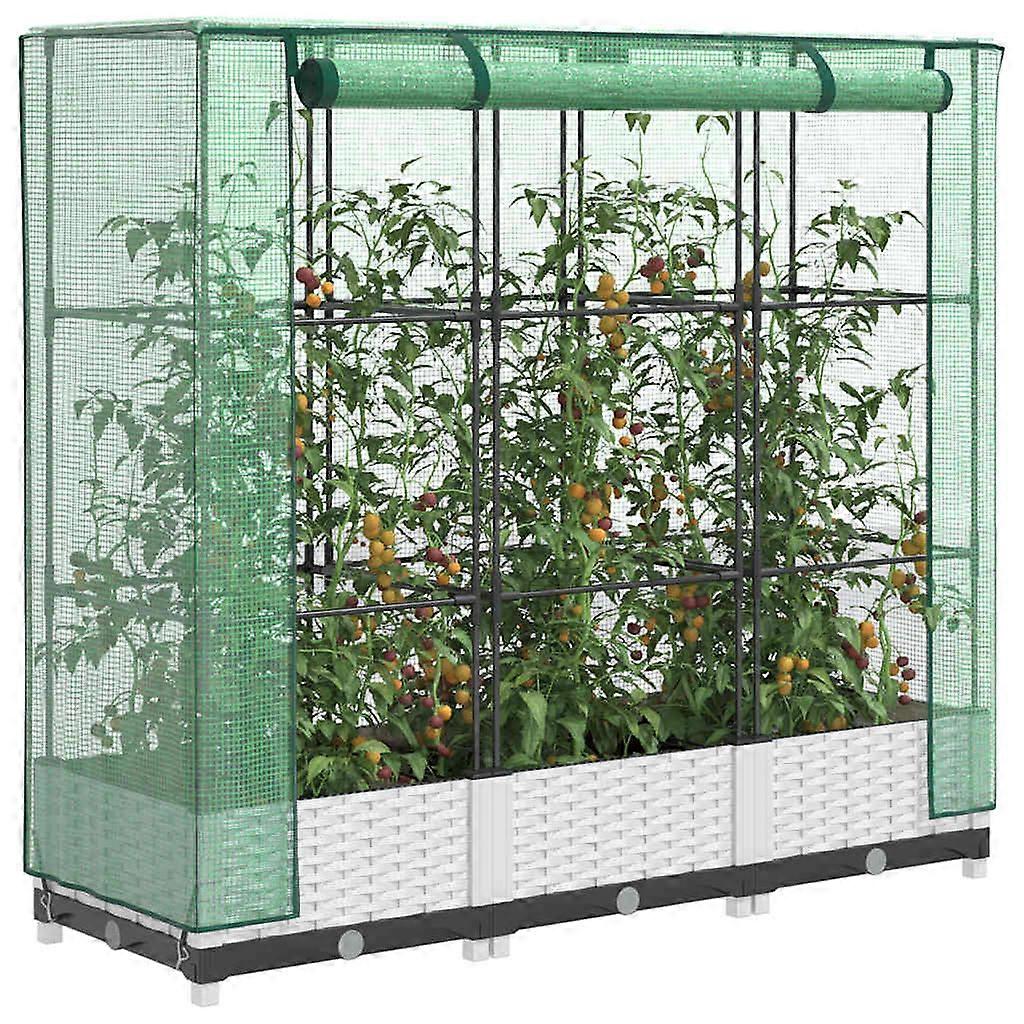 Dieses Hochbeet mit Gewächshausaufsatz bietet mit seinem stabilen Rahmen viel Platz zum Gedeihen deiner Pflanzen.Stabile Konstruktion: Das Hochbeet aus Polypropylen verfügt über einen starken Eisenrohr-Rahmen, an dem Pflanzen klettern und wachsen können.Praktischer Aufsatz: Das Hochbeet verfügt über eine wasserfeste Abdeckung aus Polyethylen, die deine Pflanzen vor extremen Temperaturen schützt und Insekten, Vögel und Kleintiere fernhält.Praktisches Design: Das Tomatenhaus verfügt über Reißverschlüsse zur Belüftung. Darüber hinaus gibt es Bänder an der Oberseite, mit denen sich das Netz leicht am Rohr befestigen lässt.Rattan-Optik: Das Hochbett im Rattan-Look verleiht deinem Außenbereich einen Hauch von natürlichem Charme.Vielseitig einsetzbar: Das Frühbeet bietet ausreichend Platz für deine Pflanzen, Gemüse, Kräuter und Blumen. Du kannst es im Garten, Innenhof, Balkon usw. verwenden. Hochbeet-Farbe: WeißNetz-Farbe: GrünHochbeet-Material: PP (Polypropylen)Netzmaterial: PE (Polyethylen)Rohrmaterial: EisenHochbeet-Abmessungen: 120 x 40 x 23 cm (L x B x H)Gewächshaus-Abmessungen: 120 x 40 x 110 cm (L x B x H)Rohr-Abmessungen: 120 x 40 x 120 cm (L x B x H)Gesamtabmessungen: 120 x 40 x 123 cm (L x B x H)Mit wasserfestem Frühbeet-AufsatzZusammenbau erforderlich: Ja