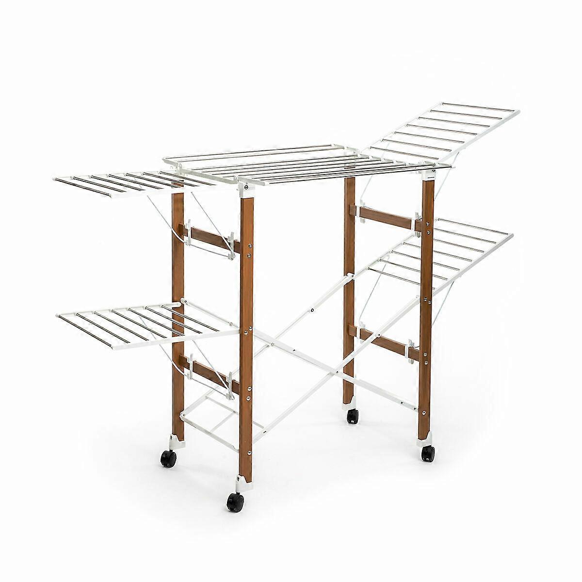 Modernes, platzsparendes Design: Unser klappbarer Wäscheständer ist robust und leicht, hat eine Struktur aus ABS-PP und verstärkte Edelstahlstangen, um Schäden durch die feuchte Wäsche zu vermeiden. Lassen Sie sich von seinem originellen Design in Weiß und Braun mit Holzeffekt überraschen.Zusammenklappbar, mehrere Positionen: dieser vertikale Wäscheständer hat 6 unabhängige Flügel (4 seitlich und 2 oben), damit Sie je nach Wäschemenge so viele ausklappen können, wie Sie benötigen. Bei den 4 Seitenflügeln können Sie 2 Neigungs- oder Höhenstufen wählen. Zusammengeklappt bleibt der Wäscheständer aufrecht stehen und nimmt wenig Platz ein, so dass er leicht hinter einer Tür, in einem Schrank usw. verstaut werden kann.38 Stangen, große Kapazität: mit seinen 38 Stangen bietet unser multifunktionaler Wäscheständer voll aufgeklappt (ca. 18,7 m) viel Platz zum Aufhängen und Trocknen. Er ist äußerst stabil, ist für alle Arten von Wäsche geeignet und kann für bis zu 20 kg Gewicht verwendet werden. Schuhhalter: dieser vielseitige und praktische Wäscheständer mit Rollen verfügt im unteren Teil über Ablagen, auf denen Sie auch Schuhwerk, wie Turnschuhe, Pantoffeln usw., das Sie gewaschen haben, unterbringen können.4 Rollen mit Rotation und Verriegelung: unser origineller tragbarer Wäscheständer verfügt über Rollen mit 360º-Drehung, um die Mobilität und Aufbewahrung zu erleichtern. Die Rollen sind außerdem mit einer Sicherheitsverriegelung versehen, die für besseren Halt und Stabilität sorgt. Sie können den Ständer sowohl im Innen- und Außenbereich bequem überall hinbewegen, wo Sie ihn brauchen.