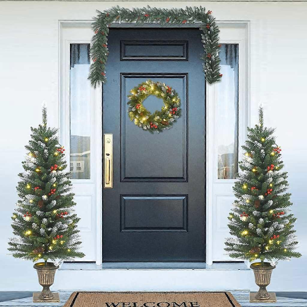 Das Türschmuck-Set verleiht deinem Zuhause zu Weihnachten eine festliche Atmosphäre. LED-Lichter: Die Weihnachtsbäume, der Kranz und die Girlande sind alle mit LEDs ausgestattet, die jede Ecke in hellem Glanz erstrahlen lassen. Sie sind ein echter Blickfang in deinem Zuhause.8 Beleuchtungsmodi: Die künstlichen Weihnachtsbäume und die Weihnachtsgirlande verfügen über 8 verschiedene Lichteffekte (Kombination, in Welle, sequentiell, langsames Glühen, jagendes/laufendes Wasser, langsames Verblassen, Glitzern/Blinken und Dauerlicht). Du kannst die Beleuchtungsmodi durch Drücken der Taste am USB wechseln, um verschiedene Stimmungen zu schaffen.Naturgetreues Material: Der Weihnachtsbaum besitzt realistische PVC-Spitzen, die dem Baum eine naturgetreue Form und Optik verleihen.Schöne Dekoration: Die Weihnachtsdeko ist außerdem mit mehreren Zapfen und Beeren verziert, was ihm ein bezauberndes und märchenhaftes Aussehen verleiht.Breite Anwendung: Die Weihnachtsdekorationen eignen sich ideal zum Schmücken des Eingangsbereichs, der Eingangstür, Terrasse, Veranda, des Gartens usw., um überall Weihnachtsfreude zu verbreiten. Gut zu wissen:Du kannst deinen Weihnachtsbaum und deine Girlande individuell gestalten, indem du die LED-Lichterketten selbst aufhängst, denn sie werden separat geliefert.Das Produkt verfügt über einen USB-Anschluss, für den eine zertifizierte 5V-USB-Stromquelle erforderlich ist (nicht im Lieferumfang enthalten).Bitte stelle sicher, dass der USB-Anschluss in einer trockenen Umgebung angeschlossen wird.Wir empfehlen, sich nach dem Zusammenbau 30-45 Minuten Zeit zu nehmen, um den Baum richtig in Form zu bringen, indem man die Äste zurückzieht und die Spitzen auseinanderzieht, um dem Baum ein voluminöses Aussehen zu verleihen.
