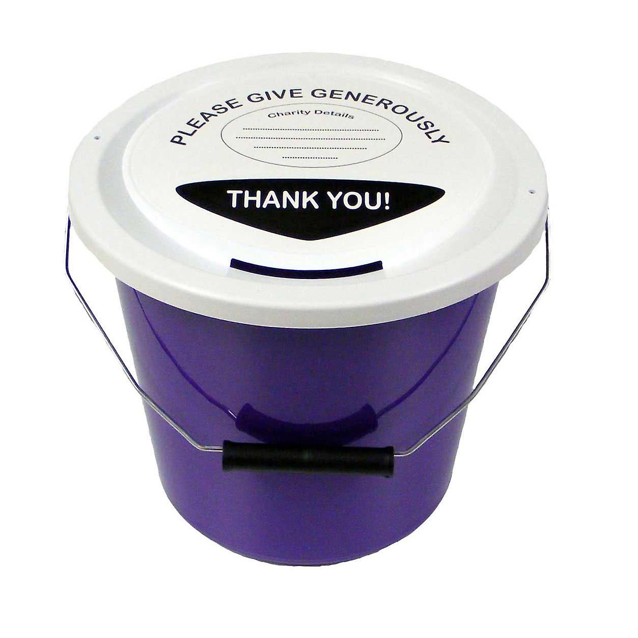 10 secure, plastic collection buckets for collecting money for charity and fundraising events.Each bucket supplied with lid, a Thank You label and 2 plastic security tiesCapacity: 5 litresDiameter: 21cmHeight: 19cmColour: Purple