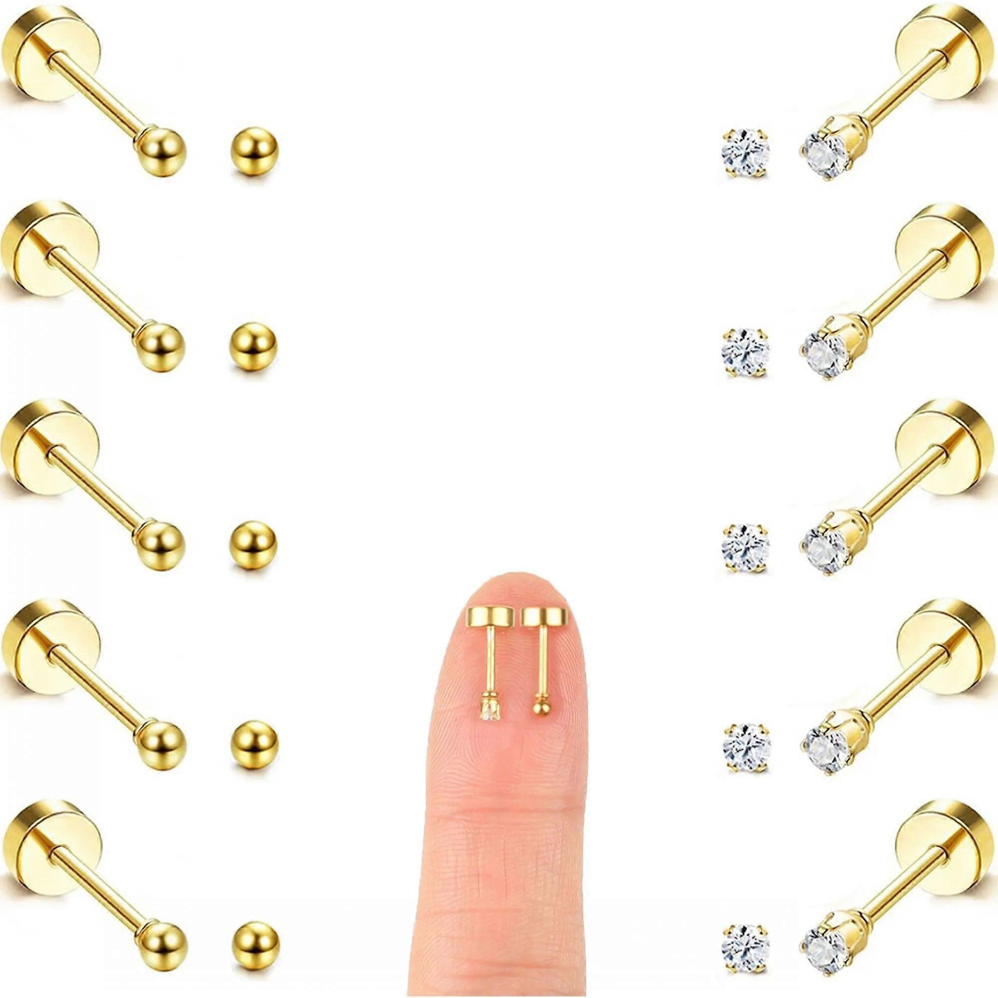 10 Pair 2mm Cz Flat Back Screw Stud Earrings Surgical Steel Cartilage Earrings