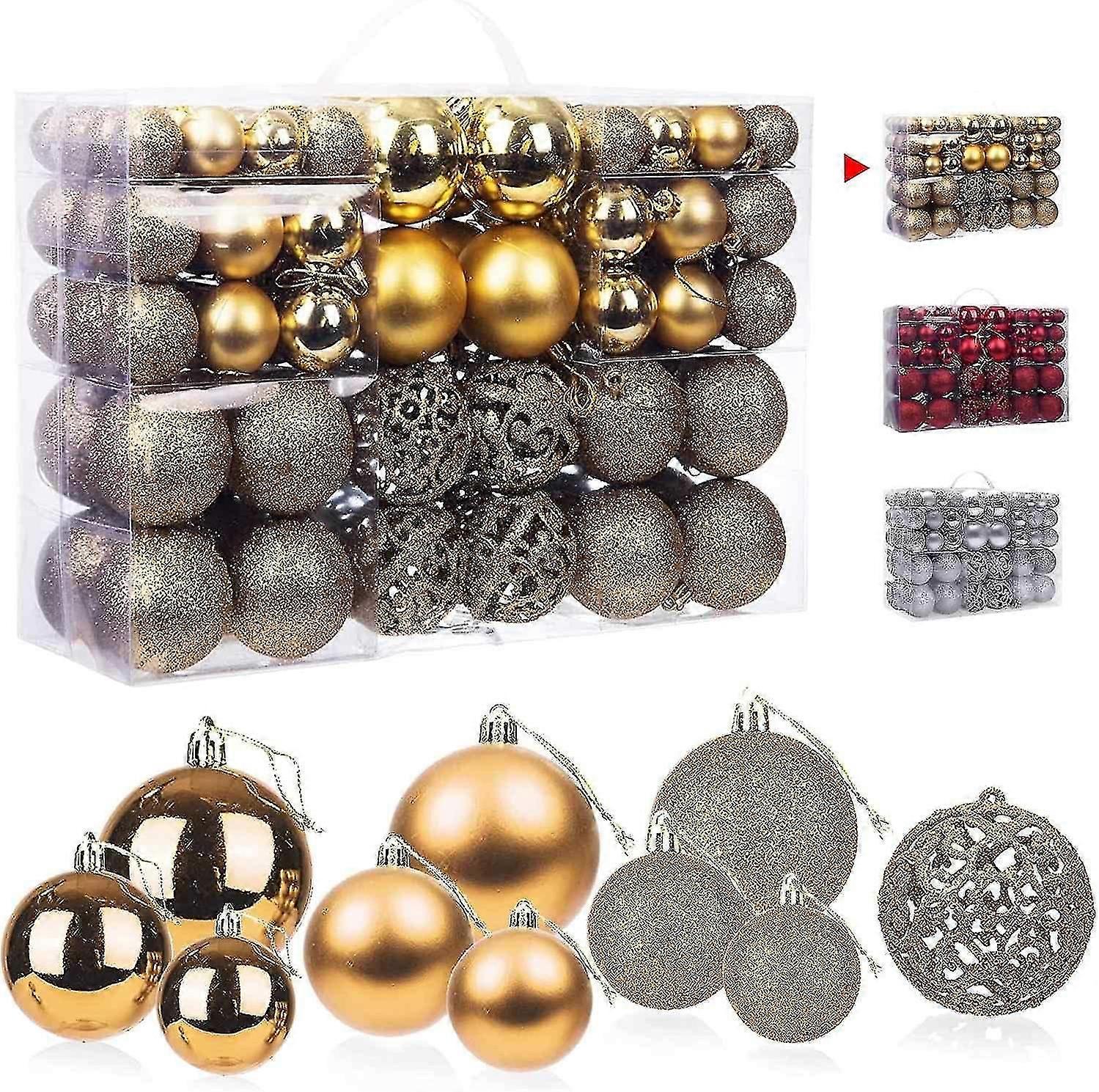Quantity: 100Pcs, Oversized Christmas Decoration Set (Family Edition). Each Ball Has A Hanging String, So You Don'T Have To Put It On In The Cold.Color And Size: Here It'S Gold, There Are 3 Sizes In Diameter ( 3Cm, 4Cm And 6Cm)High Quality: Made Of High Quality Pvc. They Are Lightweight, Unbreakable, Strong, Reusable And Safer Than Traditional Glass Products.Classic Solid Color: We Have Selected The Most Classic Three Colors With A Special Style: There Are Four Styles: Matte, Shiny, Glitter And Hollow. Simple And Versatile, It Goes Well With Other Christmas Decorations.Timeless Holiday Decorations: Used To Decorate The Christmas Window Scenery Of Homes, Hotels, Restaurants, Offices, Shopping Malls, Indoors And Outside ; Dress Up The Christmas Tree, Garland, Dining Table, Ornaments And Other Individual Needs.
