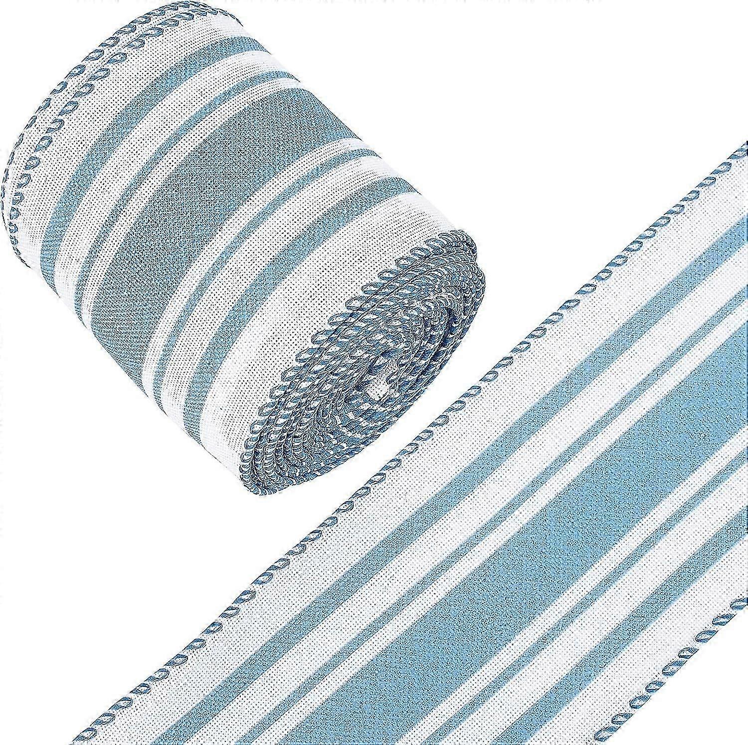 12 Yards Blue White Stripe Ribbon Wired Ribbon 2-1/2 inch Blue Burlap Ribbon Ivory Stripe Edge Blue Wired Christmas Ribbon for Wreath Garland Bow Maki