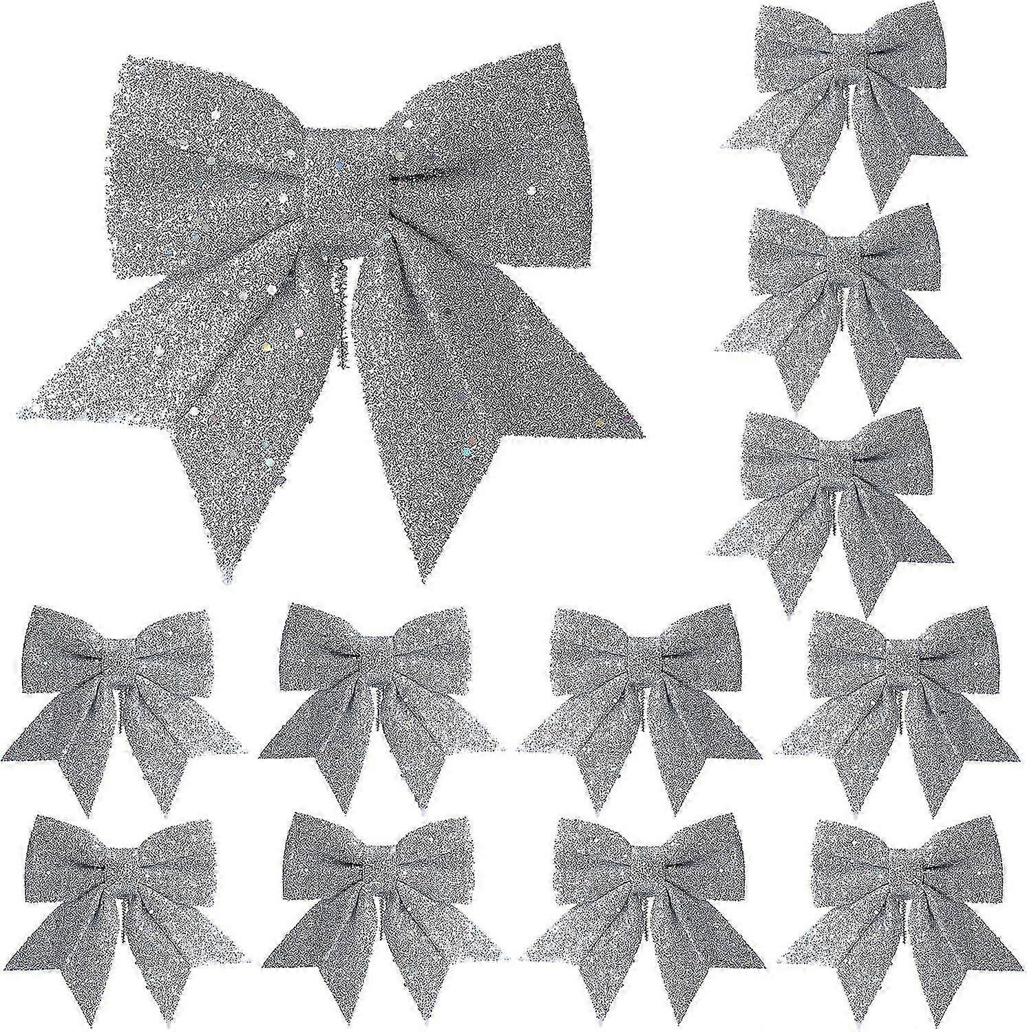 Package Including12 pack silver glitter bows, to make a wonderful filler for tree decorating. Or hanging them on your window, door, and yard fence is also a good choice.Glitter Christmas DecorationEach Christmas glitter bow measures approx 12cm x 15cm. Perfect for crafting, nice size for Xmas decorations.DurableMade of good quality material, bows are not easy to deform, safe and odorless, and in good shape. You can easily fix these bright bows on the Christmas tree, string of lights, or Christmas gift boxes.Twist Tie DesignBows are in the typical shape with glitter sequin on the surface. Each bow is fixed with a silver twist tie, which is convenient for you to easily fix and remove the Christmas bow and can be repeated to use.Wide ApplicationSmall Christmas bow with a typical silver glitter surface, perfect for a Christmas tree, and indoor outdoor home decorations. You can wear them as a festive costume accessory, or use them to decorate your trees, treetops, garlands, wreaths, light posts, gift boxes, windows, fences, and much more.