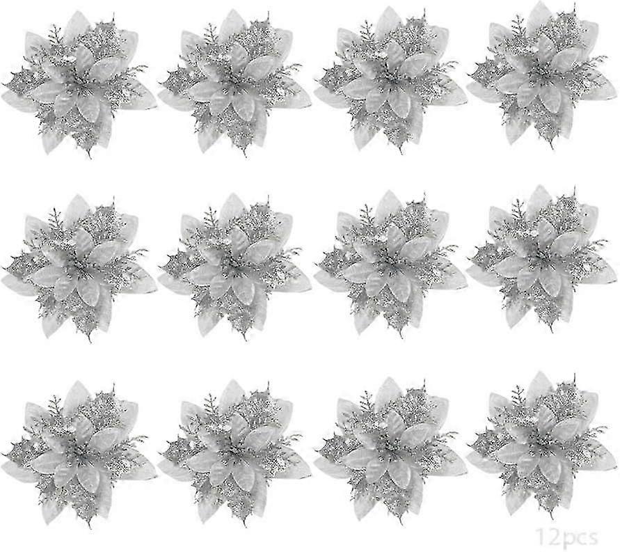 12pcs (Silver) Christmas Simulation Flower,Poinsettia Christmas Flower,Christmas Flower,Christmas Tree Decoration,Artificial Christmas Flowers