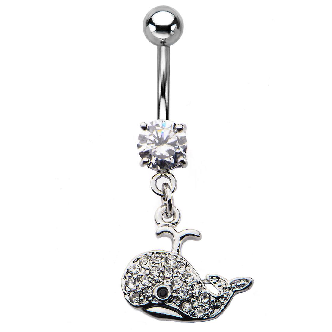14ga-3/8"(10mm) Nautical Belly Navel Ring with CZ Whale Dangle Charm Part of a new line ofnauticallythemed belly rings Features large prong-set CZGem This belly ring also features a whale dangle adorned with clear gems Shaft measures 14ga with an overall length of 3/8"(10mm) Made of 316L surgical steel - highest quality