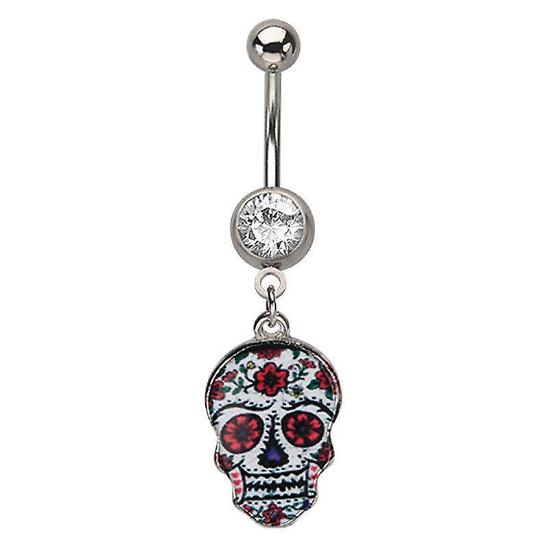 14ga Sugar Skull Flower Design Belly Ring This is a flower skull belly ring.316L Surgical steel barbell with clear cz jewel and a dangle skull charm with painted flower design.Size is 14 gauge thickness and length 10mm (3/8" inch).