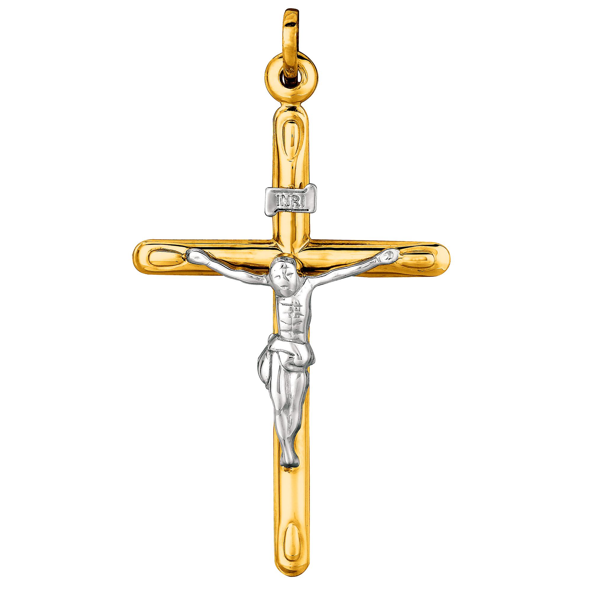 This 14K 2 tone gold traditional Crucifix is the perfect way to honor your religion. A classic gift for any religious occasion with gorgeous golden tones in simple and statement designs.The simple look makes it perfect for everyday wear, whether on its own or layered with other delicate necklaces. - This gold cross is faithfully handcrafted in real 14k gold and is stamped with the 14k metal stamp - This cross pendant has a high polished finish that gives it a shiny look - Pendant comes with no chain - An elegant statement of faith as well as a stylish piece of jewelry good for men and women - Pendant The weight of the cross is at 1.6 gr