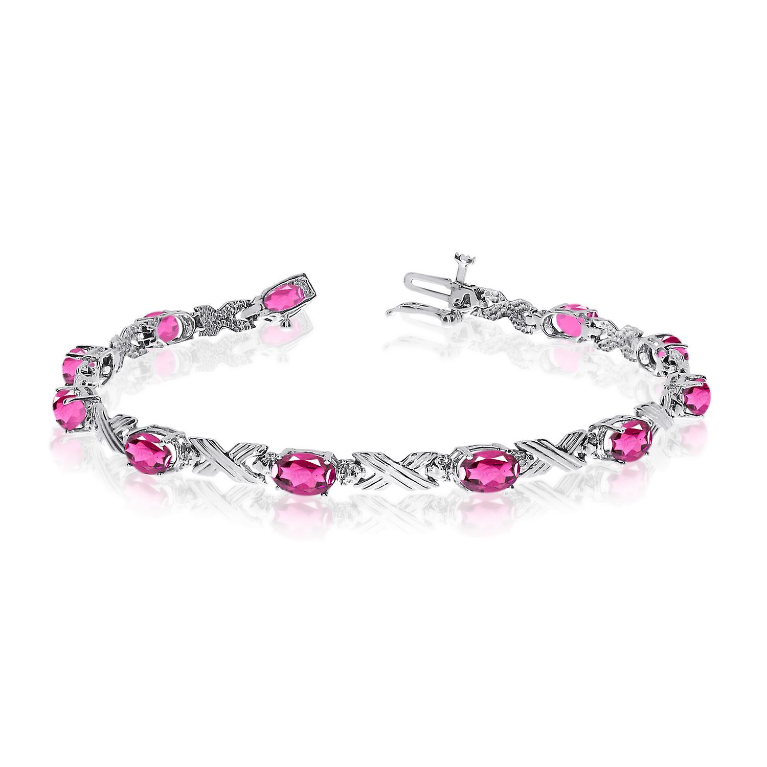 14K White Gold Oval Pink Topaz Stones And Diamonds Tennis Bracelet, 7"