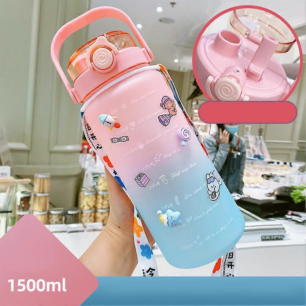 .* Made of high quality materials, durable.* Motivational design: gives you the motivation to remind you to stay hydrated and drink enough water throughout the day.* Time and capacity markers: perfect for measuring your daily water intake, it's fun to see you getting closer to your goal and makes you want to reach it sooner.* Food divider device: the water bottle is made of durable plastic, BPA free; It is odorless and healthy to drink. Parameter:Material:PCColor as shownCapacity: 1500/2000mlProduct List:Sports Bottles*1Shoulder Strap*1Sticker*13D Sticker*3Note:1. The actual colors of the item may be slightly different from the pictures shown on website caused by many factors such as brightness of your monitor and light brightness.2. Please allow slight manual measurement deviation for the data.