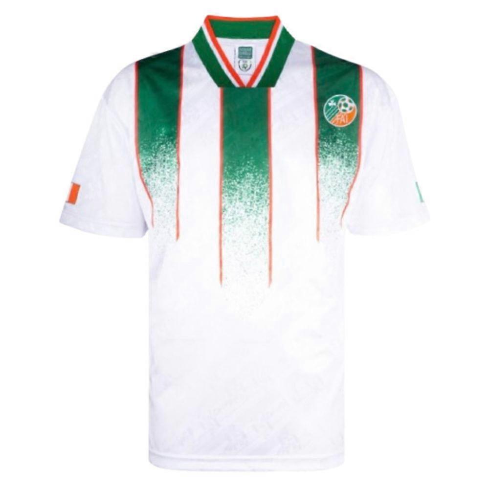 Step back into one of Irish football\'s most memorable eras with this iconic 1994 Ireland away shirt. Worn during the nation\'s remarkable journey to the knockout stages of the World Cup in the United States, this classic white jersey represents a golden period for Irish football and remains one of the most beloved kits in the team\'s history.Classic Design with Timeless AppealThe crisp white base is beautifully complemented by striking green and orange trim on the collar and sleeves, proudly showcasing Ireland\'s national colours. The bold geometric pattern subtly woven into the fabric captures the distinctive style of 1990s football kit design, whilst the embroidered crest sits proudly on the chesta symbol of national pride and footballing heritage.Make It PersonalAdd your own touch of Irish footballing magic by personalising this shirt with your favourite player\'s name and number from the legendary USA \'94 squad, or choose your own name to create a truly unique piece of memorabilia. Whether you\'re celebrating heroes like Houghton, McGrath, or Keane, or making it your own, personalisation transforms this classic shirt into a treasured keepsake.Built for ComfortCrafted from high-quality materials that balance authenticity with modern comfort, this shirt is perfect for match days, casual wear, or proudly displaying your Irish heritage. The relaxed fit ensures all-day comfort whether you\'re at the stadium, the pub, or simply showing your support.PersonalisationName & Number - Customise your jersey with the name and number of your favourite Ireland player or even your own name. We can print name in the same style worn by the players.
