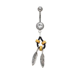 2-Jewel 316l surgical steel belly ring w/rhodium plated feather dangle