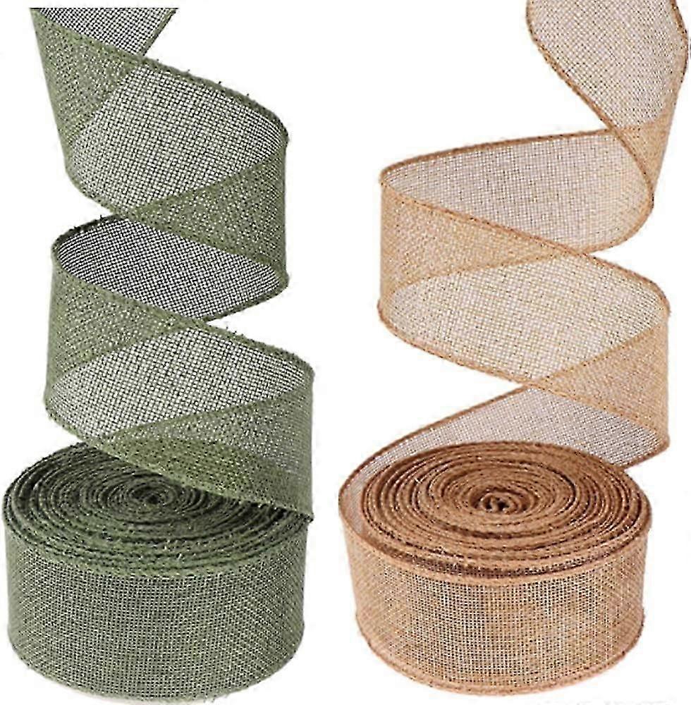 Material:Made of premium burlap material,not easy to tear,wear,wrinkle or loose,and the color is also not easy to fade,and can be stored for a long time;With wired edges,easy for you to make different shapes.Package:Package comes with 2 roll of burlap ribbon,Green and Beige could meet different your decoration needs and enhance the festival atmosphere.Feature:This burlap wrapping ribbon is designed in simple and classic style,can meet the needs of festival decorations,which can enhance the atmosphere of the festival.Easy to Cut:Into various shapes according your need. For example,tie around a rustic vase,decent pillows,pull back your curtains,make a wreath or a garland,etc.Application:Add beautiful scenery in your wedding, home, party or other occasions.