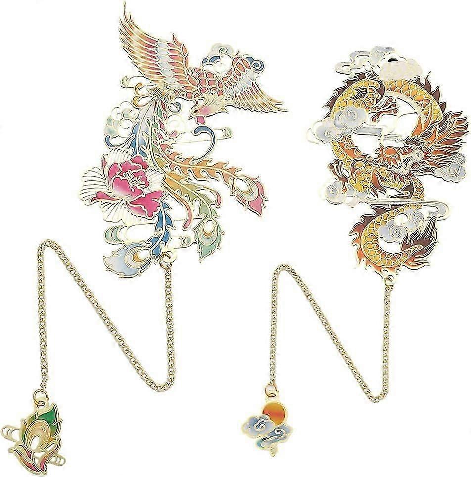 2 Style Chinese Dragon and Phoenix Brass Metal Bookmarks Vintage Book Marks Decor Metal Label Pendan for Special Holiday Women Christmas Birthday Gift