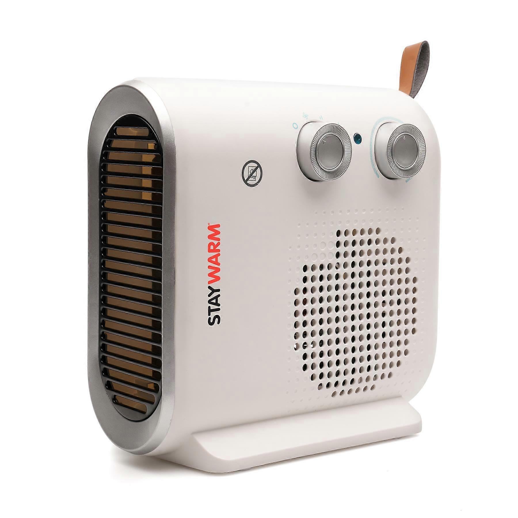 COMPACT FLATBED AND UPRIGHT DESIGN:The 2000w Fan Heater sits horizontally or stands vertically, adapting to best suit your needs. The compact, simple and lightweight design is ideal for use at home or in the office and the integral carry handle makes it easy to transport. The red power light is illuminated during use to indicate that the heating element is active.TWO HEAT SETTINGS AND COOL BLOW FAN: Switch between the two heat settings (1000w/2000w) to set the power of the fan or use the cool blow function to operate as a cooling fan. Save money and space in your home with this multi-use hot and cool fan.VARIABLE THERMOSTAT:Use the variable thermostat dial to set the temperature level. The heater will operate until the surrounding air temperature is at the set level and then will automatically switch on/off intermittently to keep a consistent temperature.FROST WATCH PROTECTION: The built-in frost watch protection allows the fan heater to switch on automatically if the room temperature dips below 5°c - just turn the dial to the minimum to keep the chill away.SAFETY FEATURES: Stay safe with automatic overheat protection to automatically cut off the unit should it overheat and the cabinet is made from fire retardant plastic. Your purchase is covered with a 3 year guarantee for added peace of mind. Make sure to complete and return the warranty card with proof of purchase. DO NOT USE WITH EXTENSION LEADS