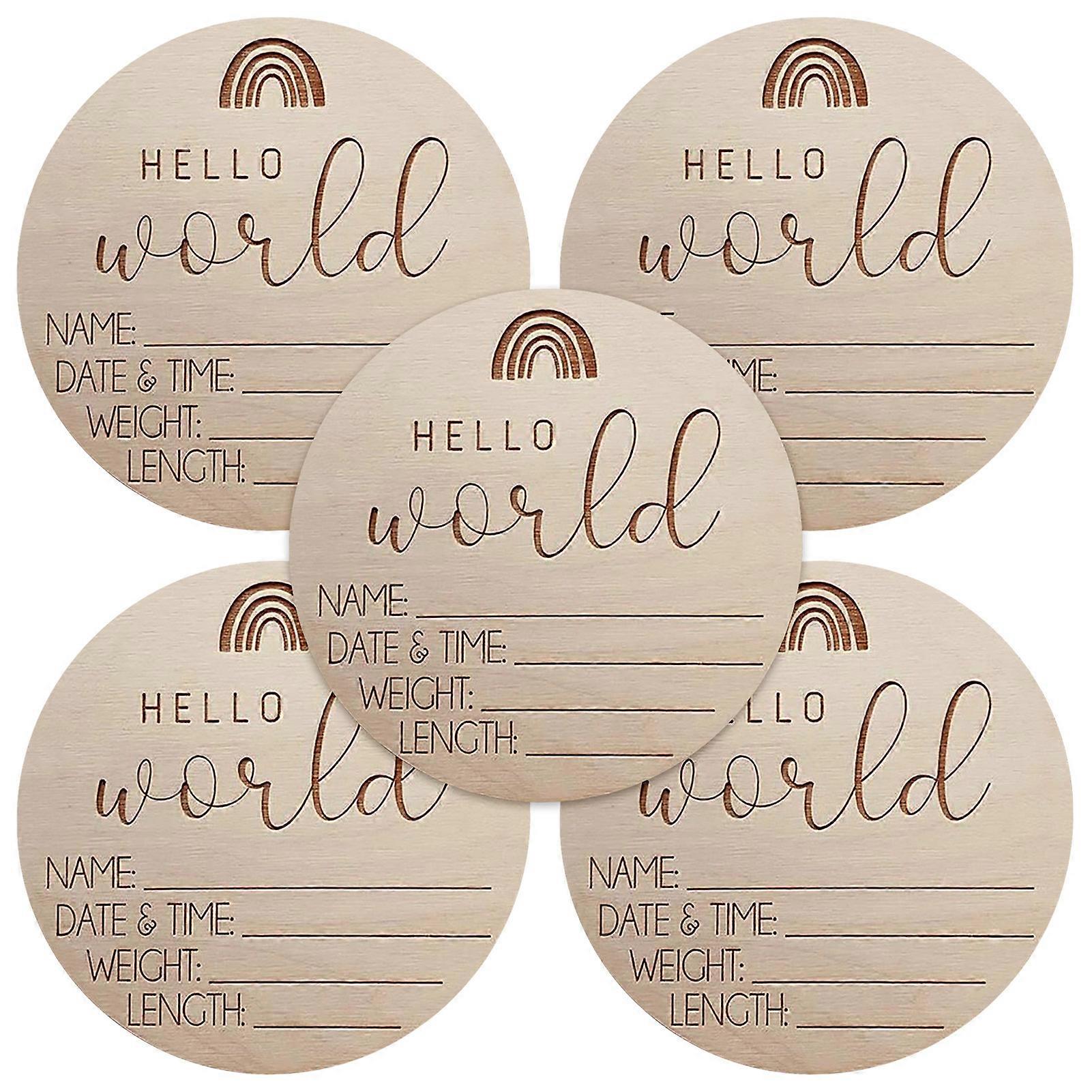 2022 Round Wooden Baby Arrival Labels Gender Baby Decoration 4 Inch Hello World Birth Announcement Sign Rainbow Baby Name Signs