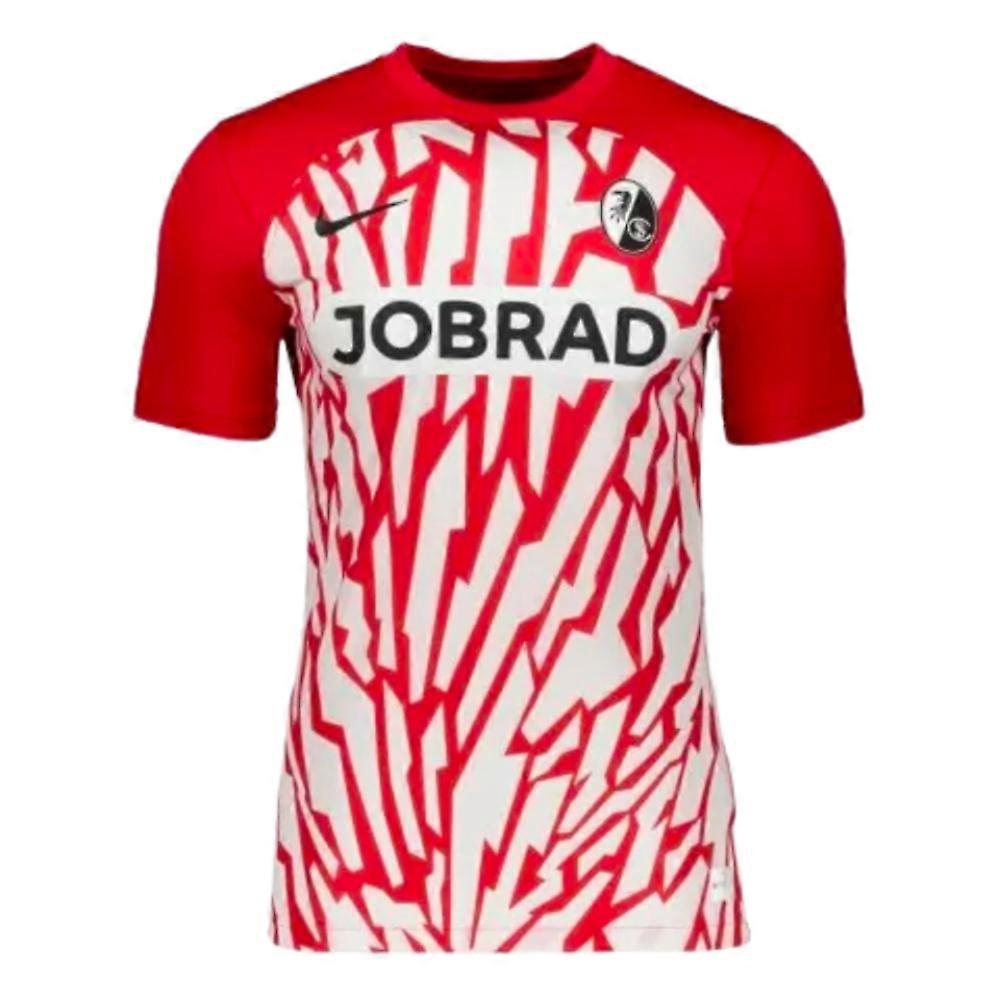 The Nike SC Freiburg 2023-2024 home shirt has a striking red and white graphic on the front, somewhat resembling large shards of glass. Red raglan-style sleeves are used, while the logos come in black, Jobrad\'s receiving a white background. PersonalisationName & Number - Customise your jersey with the name and number of your favourite SC Freiburg player or even your own name. We can print name in the same style worn by the players.