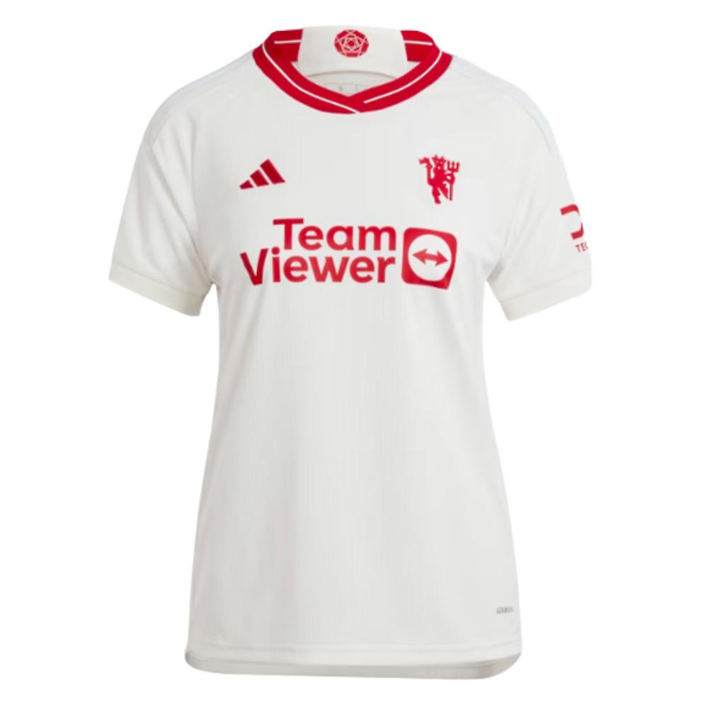 Celebrating a half-century of the iconic red devil. Clean and classic, this Manchester United 2023-2024 third women\'s jersey from adidas lets one of football\'s most recognisable symbols really shine with an eye-catching embroidered finish. Breathable mesh panels and moisture-absorbing AEROREADY make this shirt ideal for staying comfortable off the pitch. Made with 100% recycled materials.PersonalisationName & Number - Customise your jersey with the name and number of your favourite Man Utd player or even your own name. We can print name in the same style worn by the players.