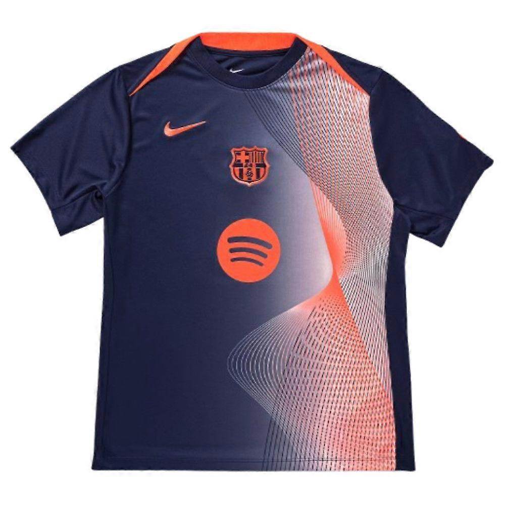 Gear up for match day in the same elite training kit worn by your Barcelona heroes. This striking third pre-match top delivers professional-grade performance with unmistakable Catalan style.Key FeaturesNike Dri-FIT Technology Advanced moisture-wicking fabric draws sweat away from your skin to keep you cool and focused during intense training sessions or casual wear.Dynamic Design Eye-catching midnight navy base colour enhanced by vibrant bright mango accents and a sophisticated geometric pattern that flows across the front, creating a bold visual statement worthy of Camp Nou.Authentic Club DetailsEmbroidered FC Barcelona crest positioned over the heartNike Swoosh logo in bright mangoSpotify partnership logo prominently displayed BARA branding on the reverse in striking orange letteringBright mango collar and shoulder panels for added visual impactProfessional Fit Tailored for optimal movement with a comfortable crew neck design and short sleeves that allow unrestricted motion whether you\'re training or supporting from the stands.Premium Construction Built to the same exacting standards as the official team kit, ensuring durability and performance that matches your passion for the beautiful game.Perfect ForPre-match warm-ups and training sessionsShowing your Barcelona pride on match daysCasual wear with authentic football styleCollectors of official FC Barcelona merchandiseShow your allegiance to the Blaugrana with this distinctive third kit that perfectly captures Barcelona\'s innovative spirit and rich footballing heritage.