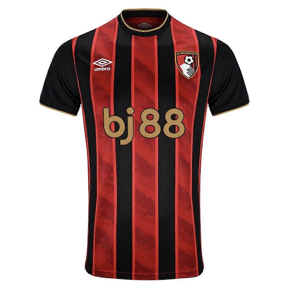 Show your support for the Cherries with the official Bournemouth 2025/26 home shirt from Umbro. This premium football shirt features the club\'s iconic red and black stripes, proudly representing AFC Bournemouth\'s heritage and passion.Crafted with Umbro\'s advanced performance fabric technology, this shirt delivers exceptional comfort whether you\'re cheering from the stands or playing on the pitch. The lightweight, breathable material wicks away moisture to keep you cool and dry, whilst the tailored fit ensures freedom of movement.Key Features:Official AFC Bournemouth 2025/26 home shirtClassic red and black striped designUmbro\'s signature diamond logoMoisture-wicking fabric technologyComfortable regular fitPersonalisation Available Make this shirt uniquely yours Add your name, favourite player\'s name, or chosen number to the back of the shirt. PersonalisationName & Number - Customise your jersey with the name and number of your favourite Bournemouth player or even your own name. We can print name in the same style worn by the players.