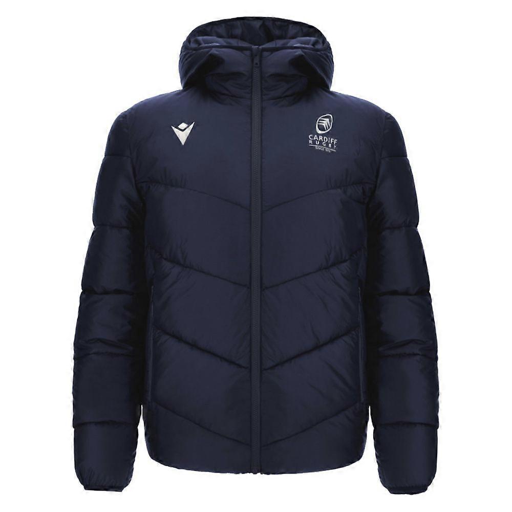 Show your unwavering support for Cardiff Rugby with this premium padded bomber jacket from the official 2025/26 collection. Combining classic bomber styling with modern performance features, this jacket is perfect for matchday, training, or casual wear throughout the season.Key FeaturesPremium Construction Expertly crafted with high-quality materials and attention to detail, this bomber jacket delivers exceptional durability and comfort. The padded design provides excellent insulation whilst maintaining a sleek, contemporary silhouette that looks brilliant whether you\'re in the stands or on the streets.Official Team Design Featuring authentic Cardiff Rugby branding and the distinctive club colours, this jacket proudly displays your allegiance to the Blues. The 2025/26 season design incorporates the latest team aesthetics with subtle design elements that true supporters will appreciate.All-Weather Performance The water-resistant outer shell helps protect against light rain and wind, making it ideal for unpredictable Welsh weather. The padded insulation ensures you stay warm during those chilly evening matches at the Arms Park.Versatile Styling The classic bomber cut with ribbed cuffs, collar, and hem creates a timeless look that works perfectly with jeans, tracksuit bottoms, or smart casual attire. Whether you\'re supporting the team or simply representing Cardiff Rugby in your daily routine, this jacket delivers effortless style.Technical DetailsWater-resistant outer fabricLightweight yet warm paddingFull-zip front closureRibbed collar, cuffs, and hemSide pockets for practicalityOfficial Cardiff Rugby brandingPerfect ForMatchday support at Cardiff Arms ParkTraining sessions and club activitiesCasual everyday wearGift for Cardiff Rugby supportersBuilding your official team wardrobeBack the Blues in style with this essential piece of Cardiff Rugby kit. Whether you\'re cheering from the terraces or representing the club around Cardiff and beyond, this padded bomber jacket combines comfort, quality, and team pride in one outstanding garment.
