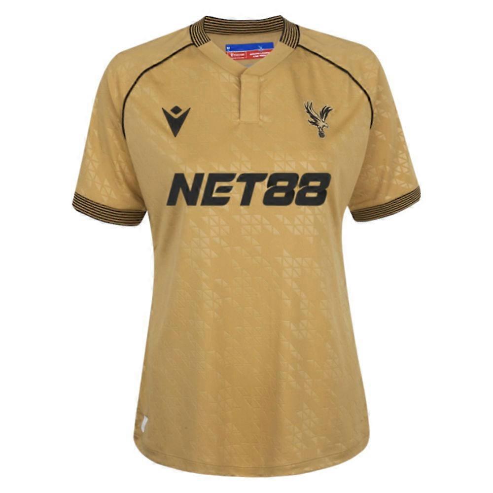 Show your Palace pride in style with this stunning women\'s third shirt for the 2025/26 season. This eye-catching Eagle Gold design captures the essence of Crystal Palace\'s fierce spirit whilst delivering contemporary fashion-forward appeal.Key Features:Official Crystal Palace third kit for 2025/26 seasonPremium Macron construction for superior comfort and durabilityStriking Eagle Gold colourway that stands out from the crowdTailored women\'s fit for optimal comfort and styleMoisture-wicking fabric technology keeps you cool and dryAuthentic club crests and sponsor detailsPersonalisation Available Make this shirt uniquely yours Add your name, favourite player\'s name, or any text of your choice to create a truly bespoke piece of Palace memorabilia. Perfect for match days, casual wear, or as a special gift for the Eagles fan in your life.Whether you\'re cheering from the stands at Selhurst Park or supporting from afar, this third shirt combines authentic club heritage with modern athletic performance. The bold Eagle Gold design ensures you\'ll stand out whilst showing your support for the Eagles.PersonalisationName & Number - Customise your jersey with the name and number of your favourite Crystal Palace player or even your own name. We can print name in the same style worn by the players.