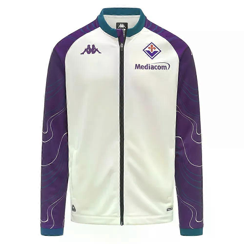 Step out in style with the official Fiorentina pre-match track top for the 2025/26 season. This premium Kappa training jacket embodies the elegance and passion of La Viola, featuring the club\'s distinctive white and violet colourway that\'s instantly recognisable to fans worldwide. Crafted from high-performance technical fabric, this track top delivers superior moisture management and breathability, keeping you comfortable whether you\'re warming up on the pitch or supporting from the stands. The ergonomic fit allows for unrestricted movement, whilst the durable construction ensures it will withstand regular wear.Key Features:Official Fiorentina 2025/26 pre-match designPremium Kappa construction with technical performance fabricClassic white base with striking violet accentsFull-zip fastening with stand-up collarRibbed cuffs and hem for secure fitEmbroidered Fiorentina club crestKappa logo detailingPerfect for training sessions, matchday wear, or casual outings, this track top lets you showcase your allegiance to ACF Fiorentina whilst enjoying professional-grade sportswear quality. The timeless design ensures it will remain a wardrobe staple long after the season ends.PersonalisationTrainers Personalisation - Customise your item by adding your initials or squad number.