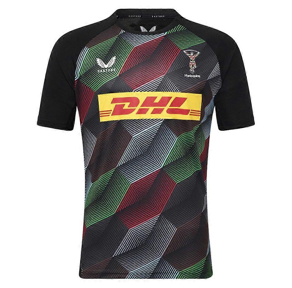 Step onto the pitch in style with the official Harlequins 2025-2026 Pre-Match Tee by Castore. This striking training shirt showcases the club\'s iconic multicoloured heritage through a bold geometric pattern that captures the essence of the famous Harlequins quarters in a thoroughly modern design.Key FeaturesDynamic Design The shirt features an eye-catching angular pattern in the traditional Harlequins colours of green, red, white, and black. The geometric lines create a sense of movement and energy, perfectly reflecting the dynamism of rugby whilst paying homage to the club\'s rich history.Premium Construction Crafted by Castore using advanced performance fabrics, this pre-match tee is engineered for optimal comfort during warm-ups and training sessions. The technical construction ensures durability whilst maintaining the lightweight feel essential for athletic performance.Authentic DetailsOfficial Harlequins club crest prominently displayed on the chestCastore logo featuring the brand\'s distinctive wing motifDHL partnership branding across the chest in bold yellow and redClassic black sleeves and collar for a sleek, professional finishSubtle Harlequins branding on the sleevePerformance FeaturesMoisture-wicking technology to keep you dry during intense trainingBreathable fabric construction for enhanced comfortAthletic fit designed for freedom of movementDurable construction built to withstand regular wearStylingThis versatile pre-match tee works brilliantly as both training wear and casual supporter gear. The sophisticated black base with the vibrant geometric pattern makes it perfect for wearing to matches, training sessions, or simply showing your Quins pride around town.PersonalisationName & Number - Customise your jersey with the name and number of your favourite Harlequins player or even your own name. We can print name in the same style worn by the players.