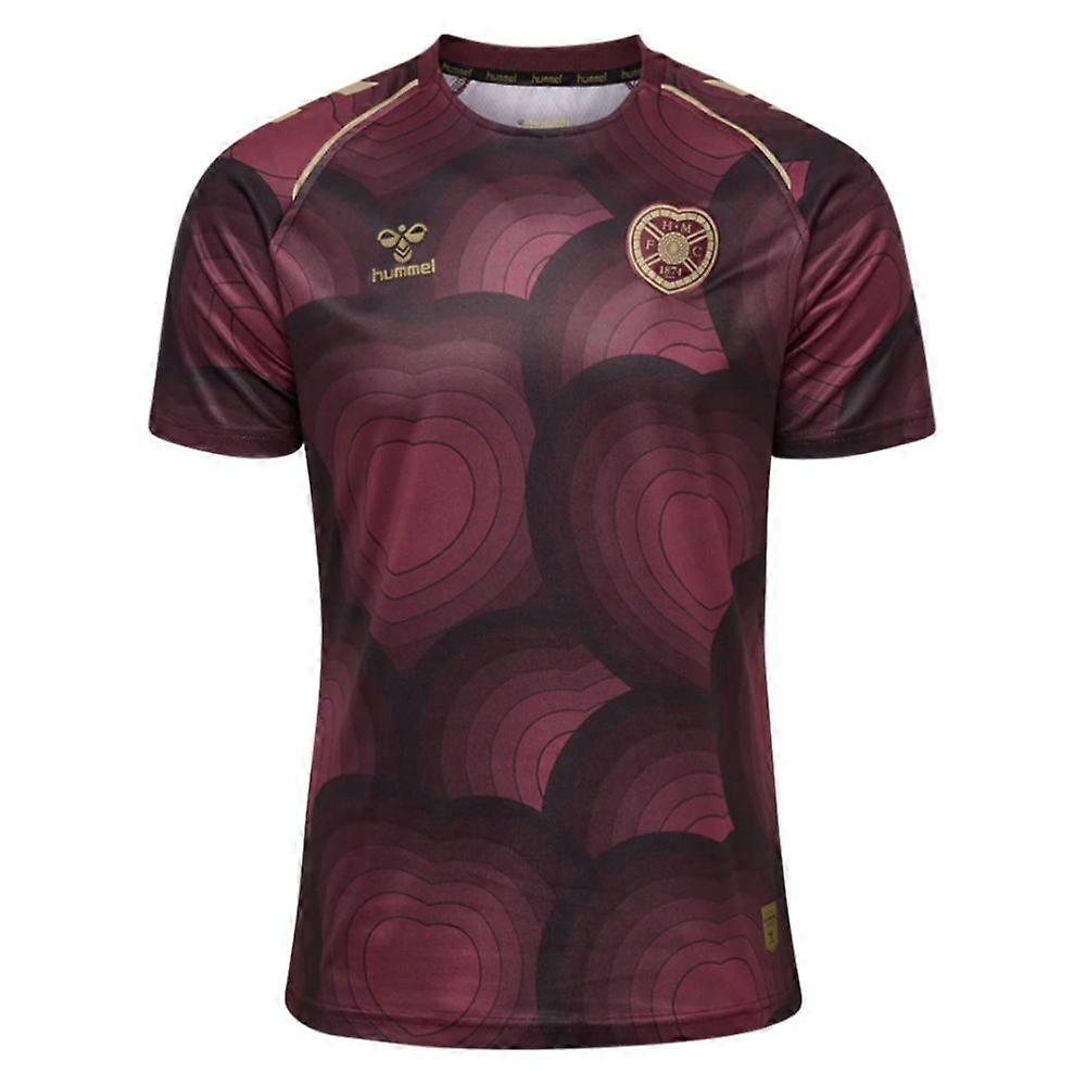 Step onto the pitch in true Jambos style with the official 202526 Hearts Hummel Home Pre-Match Shirt - a sleek, performance-ready design inspired by the clubs proud Edinburgh heritage.Crafted by Hummel, this lightweight top combines breathable performance fabric with the brands signature chevrons across the shoulders and sleeves. The deep maroon base and tonal geometric pattern pay tribute to Tynecastles history while keeping you comfortable during training sessions or casual wear.Featuring an ergonomic fit and moisture-wicking technology, this shirt helps you stay cool before kick-off or on the move. The woven club crest sits proudly on the chest, a mark of loyalty that stands out on and off the pitch.Personalise your Hearts pre-match shirt with official name and number printing for an authentic match-day finish - the perfect gift for dedicated supporters or a stylish addition to your own collection.PersonalisationName & Number - Customise your jersey with the name and number of your favourite Hearts player or even your own name. We can print name in the same style worn by the players.