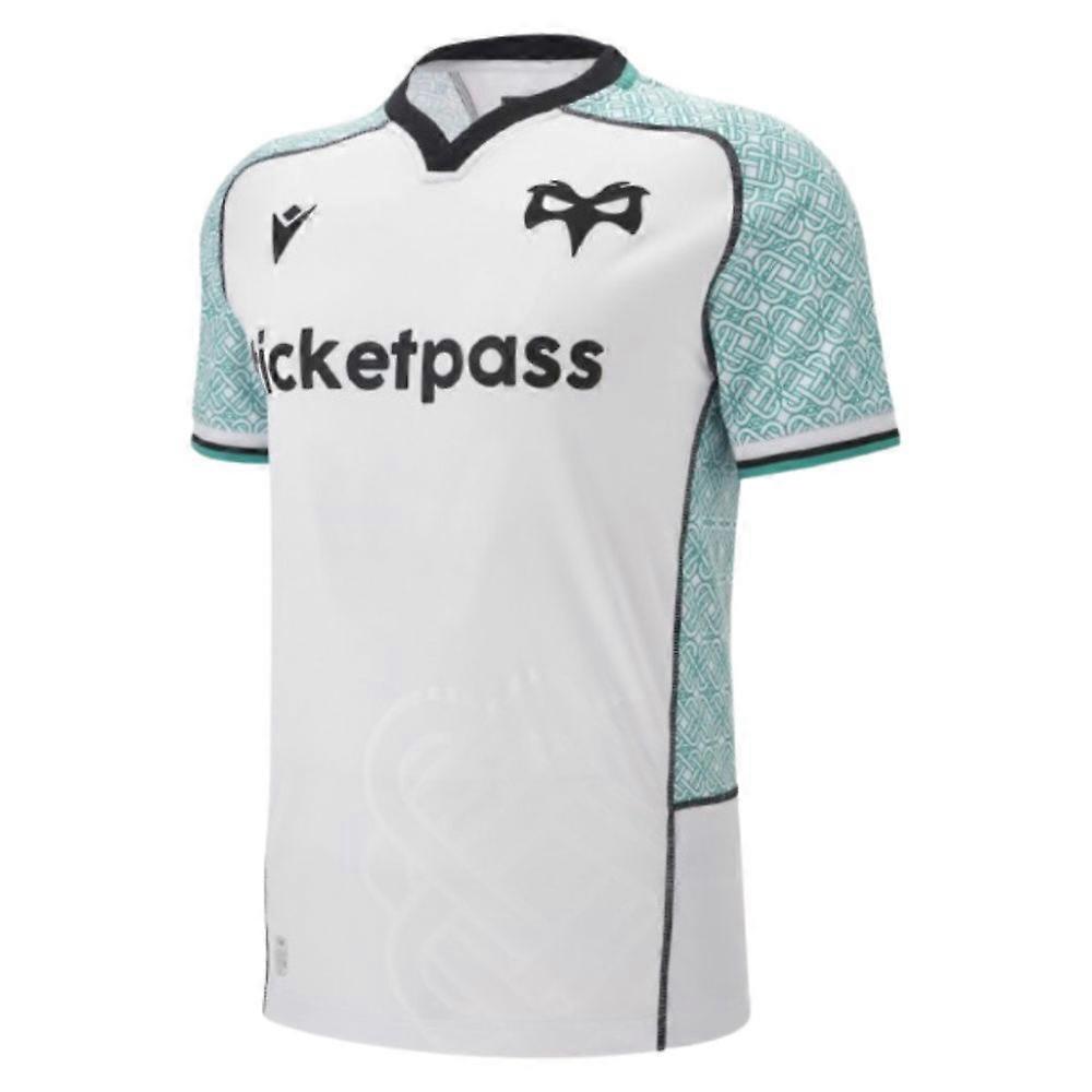 Step out in the stunning new Ospreys 2025/26 Away Replica Shirt and demonstrate your support for the region\'s finest rugby team. This exceptional piece combines traditional Welsh heritage with contemporary design, creating a shirt that\'s as striking off the pitch as it is on it.Design & ColourwayThe 2025/26 away shirt features a sophisticated white base enhanced with vibrant teal accents that capture the essence of the Welsh coastline. Eye-catching black detailing adorns the V-neck collar, sleeve edges, and seams, creating a sharp, professional finish that commands attention.The standout feature is the intricate Celtic knot graphic that decorates the shoulders, sleeves, and sides. This repeated pattern, rendered in teal against the crisp white background, pays homage to Wales\' rich Celtic heritage whilst adding a distinctive modern twist.Key FeaturesOfficial Licensed Product: Authentically designed and manufactured by Macron in close partnership with Ospreys RugbyPremium Construction: Crafted from high-quality materials for durability and comfortRelaxed Fit: Comfortable cut suitable for matchday wear or casual occasionsEmbroidered Club Crests: Proudly displays the official Ospreys badgeCeltic Heritage Design: Features traditional Celtic knot patterns celebrating Welsh cultureMoisture-Wicking Technology: Advanced fabric keeps you comfortable whether supporting from the stands or playing in the parkPerfect ForMatchday support at the Swansea.com StadiumTraining sessions and casual rugby activitiesEveryday wear to showcase your Ospreys prideGift-giving for fellow supportersPersonalisationName & Number - Customise your jersey with the name and number of your favourite player or even your own name. We can print name in the same style worn by the players.