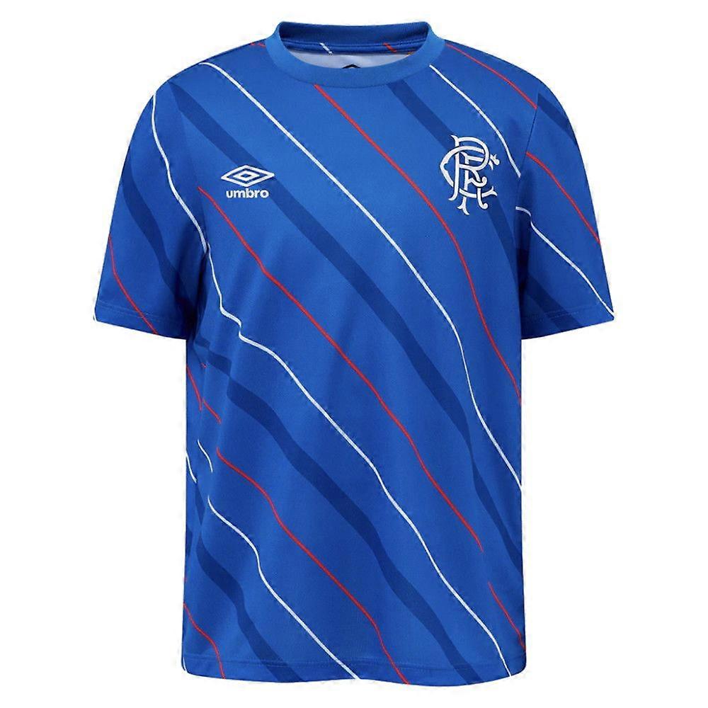 Get your young Gers supporter match-ready with the official 2025-2026 Rangers home pre-match tee from Umbro. Designed specifically for junior fans, this training shirt lets kids emulate their heroes as they prepare for battle at Ibrox.Design & StyleThis pre-match tee captures the essence of Rangers FC with a design inspired by the club\'s iconic home colours. Your young fan will feel part of the squad as they wear the same style the players don during their crucial warm-up routines before kick-off.Featuring the legendary Umbro double diamond and the prestigious Rangers crest, this tee is a symbol of the club\'s rich history and winning mentality. It\'s perfect for training sessions, matchdays, or everyday wear for devoted young supporters.Technical PerformanceBuilt with active kids in mind, this pre-match shirt utilises Umbro\'s performance fabric technology to ensure comfort during any activity. The lightweight, breathable material helps regulate temperature and wicks away moisture, keeping young fans cool whether they\'re playing football in the garden or cheering on the Gers.The durable construction withstands regular wear and washing, making it ideal for energetic youngsters who live and breathe Rangers.PersonalisationMake it extra special with our personalisation service. Add your child\'s name, their favourite player\'s name and number, or create a unique combination that makes this pre-match tee truly their own. It\'s the perfect gift for birthdays, Christmas, or any occasion for your junior Bear.PersonalisationName & Number - Customise your jersey with the name and number of your favourite Rangers player or even your own name. We can print name in the same style worn by the players.