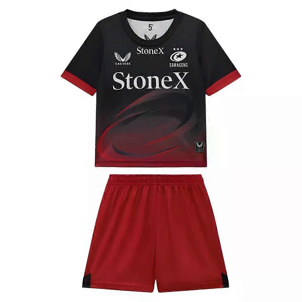 Introduce your little rugby fan to the pride of North London with the official 2025-2026 Saracens home infant kit. Expertly crafted by Castore, this stunning two-piece set captures the essence of one of rugby\'s most successful clubs in a design that\'s perfect for your future Sarries supporter.Key Features:The kit features Saracens\' iconic black and red colourway with a striking gradient design that flows from deep black at the top to rich red at the bottom. The jersey showcases the club\'s distinctive three-star crest alongside premium sponsor branding from StoneX, whilst the back displays additional partnerships with Shawbrook and ENMO, reflecting the professional match-day aesthetic.What\'s Included:Short-sleeved jersey with crew neck collarMatching red shorts with black side panelsComfortable elasticated waistband for easy changingDesign Details:The jersey features Castore\'s signature attention to detail, including the club\'s EST. 1876 heritage marking and the iconic Saracens crest with its three championship stars. The dynamic swoosh graphic element adds modern flair whilst maintaining the traditional club identity. Red sleeve cuffs and collar trim provide the perfect finishing touches.The shorts feature the Trek sponsor logo and subtle Castore branding, completing the authentic matchday look that mirrors what the first team wears at The StoneX Stadium.Perfect For:Whether it\'s their first trip to Allilianz Park, playing in the garden, or simply showing their Saracens pride, this kit ensures your little one looks the part as a member of Wolfpack Nation.PersonalisationName & Number - Customise your jersey with the name and number of your favourite Saracens player or even your own name. We can print name in the same style worn by the players.
